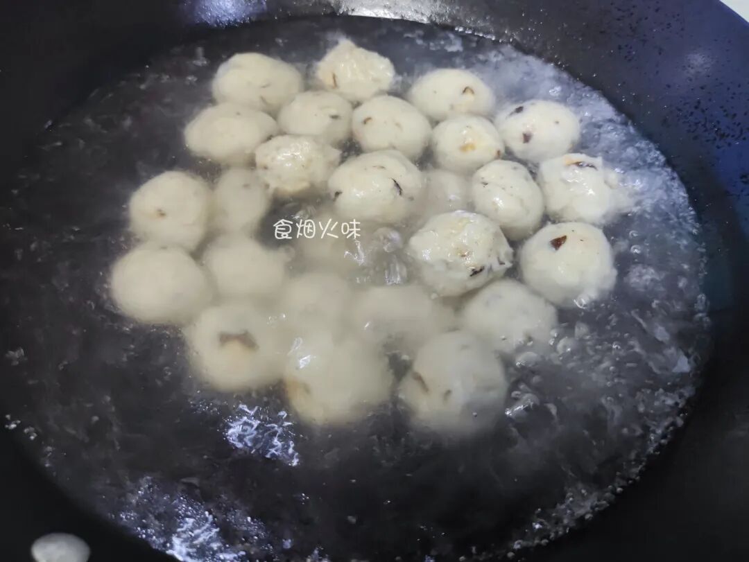 9.准备一个干净的锅,锅中加入适量的水,等待锅中的水开后,将处理好的芋艿丸子倒入里面。刚开始放入的时候不用搅动它。差不多1分钟后,稍微用勺子搅动,防止其黏在一起;