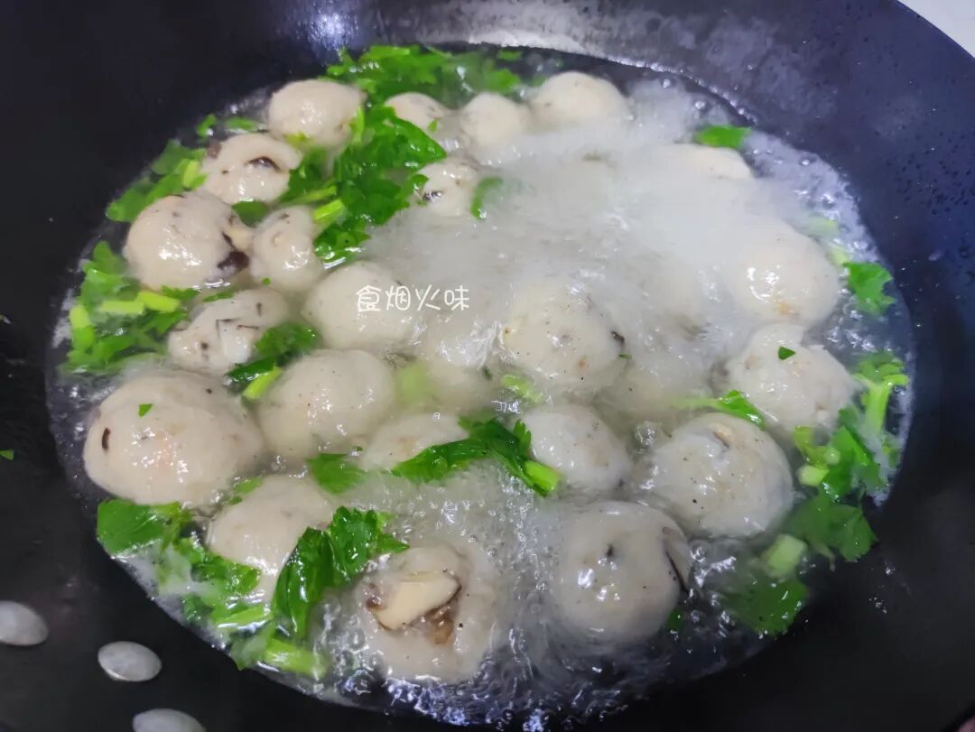 10.煮芋艿丸子的时候,将准备好的芹菜叶子放在清水中冲洗干净,洗净后的芹菜叶子放在案板上切成小段。锅中的芋艿丸子煮熟后就会浮在表面上,加入适量的食盐,胡椒粉,还有芹菜叶子也倒入里面。用勺子将其搅动均匀后,尝试一下味道即可关火出锅。