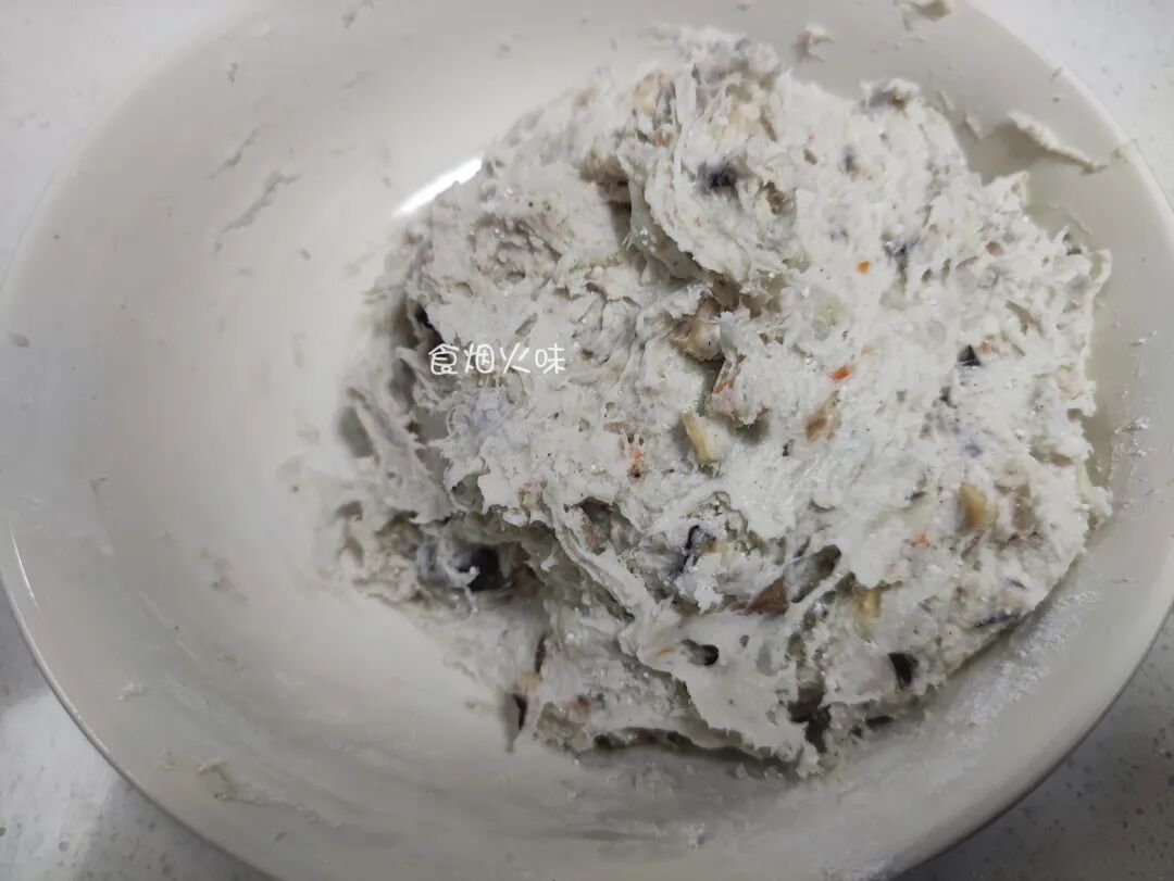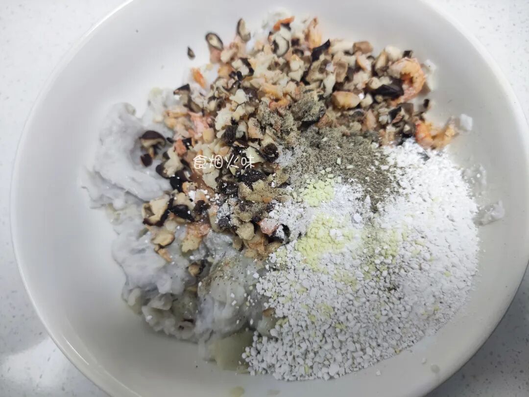 6.香菇虾米丁倒入里面,加入适量的食盐,鸡精还有胡椒粉,地瓜粉。用干净的小手徒手将它们搅拌成均匀;