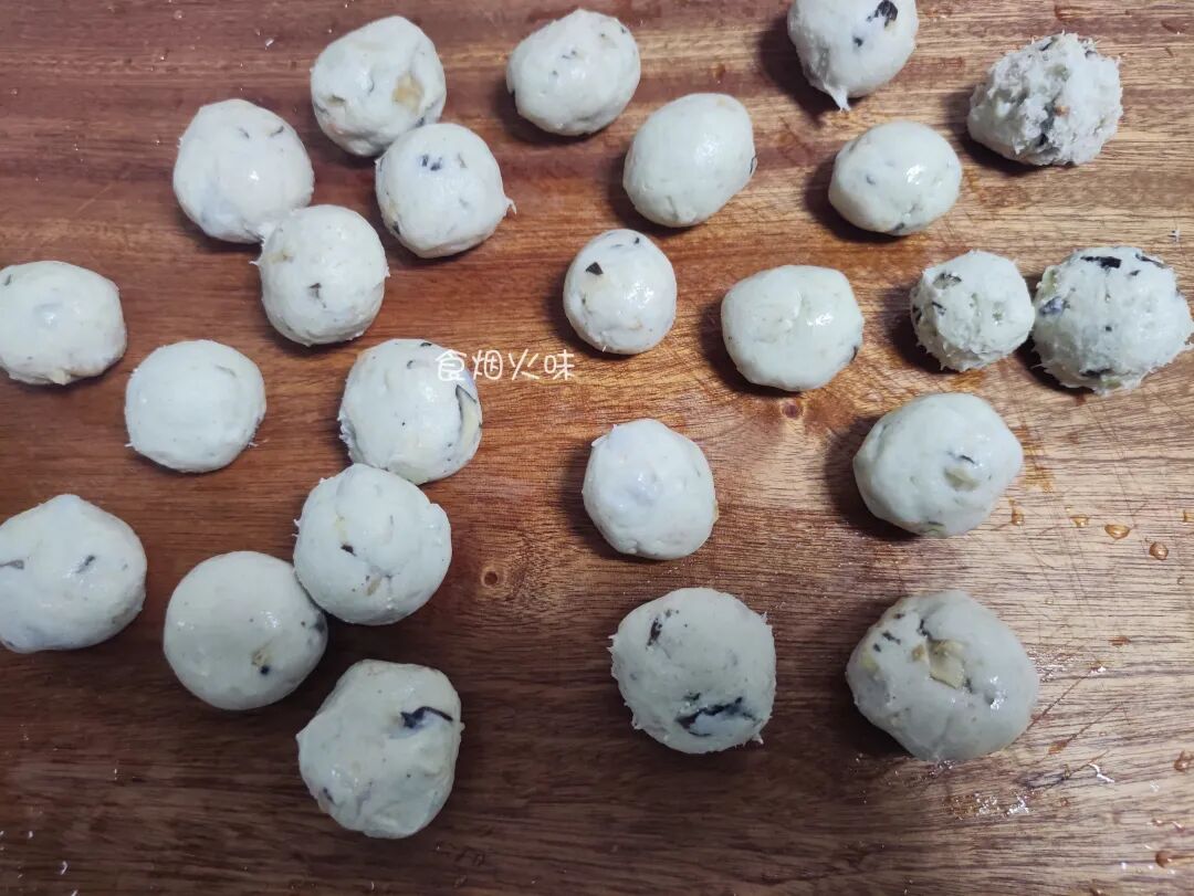 2.芋艿煮熟后去皮,然后捣成泥。加入自己喜欢的食材搅拌,捏成丸子即可;