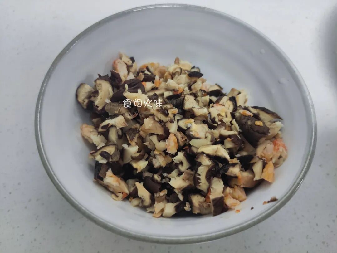 4.用干香菇的口感会相对于新鲜的鲜香好吃,准备好的干香菇放在温水中浸泡,经过浸泡的香菇会变大,放在水中冲洗干净。洗净后的香菇放在案板上,用刀将其切成细丁状。虾米放在水中洗净,也放在案板上,用刀将其切成细丁状,切好的香菇跟虾米放在一旁备用;