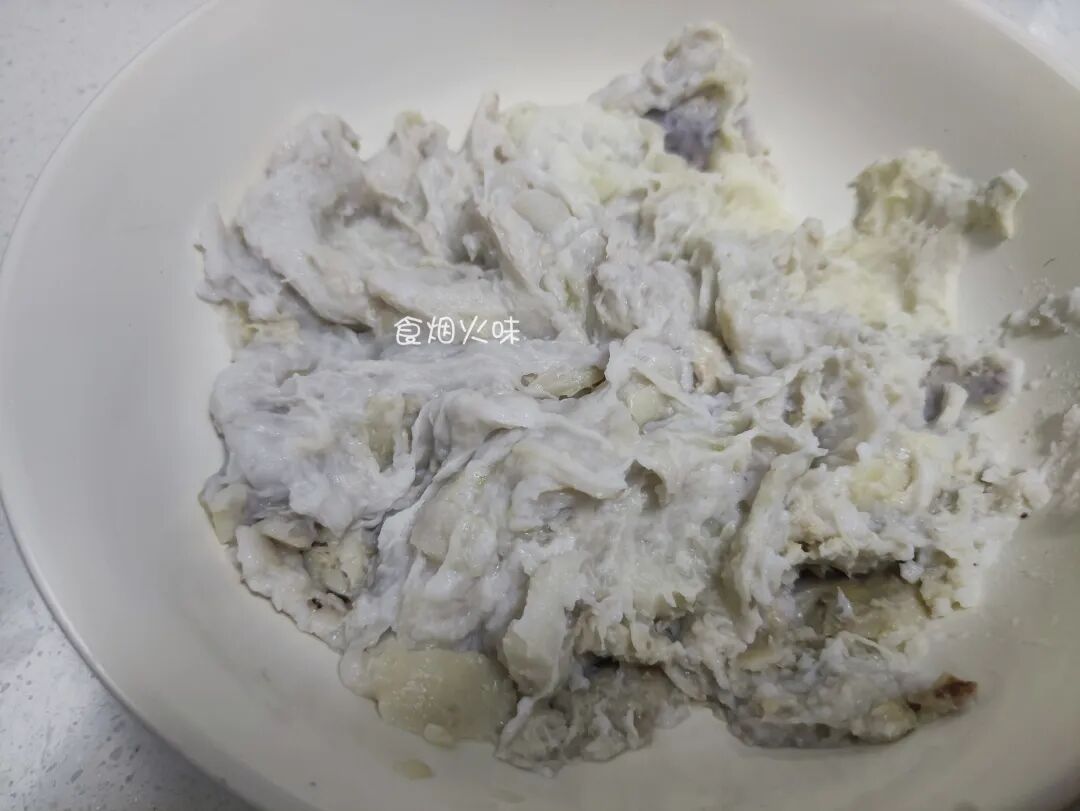 5.放凉后的芋艿就很容易去皮,直接用手将其表皮去掉。然后用勺子或者捣烂的工具将其捣成泥,捣好的芋艿泥放在一旁备用;