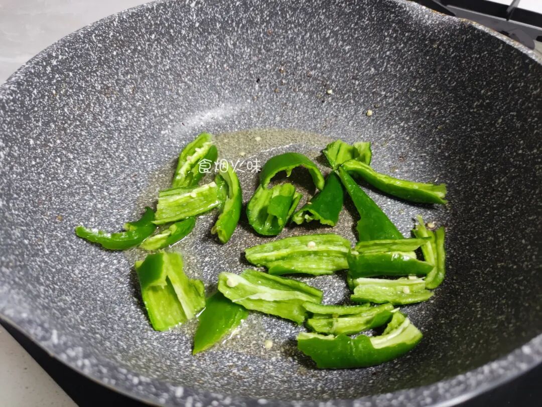 3.准备一个干净的锅,锅中的水分干后,倒入适量的油。将切好的线椒倒入里面,用小火将它们煸炒至表面有微微焦皱的状态;