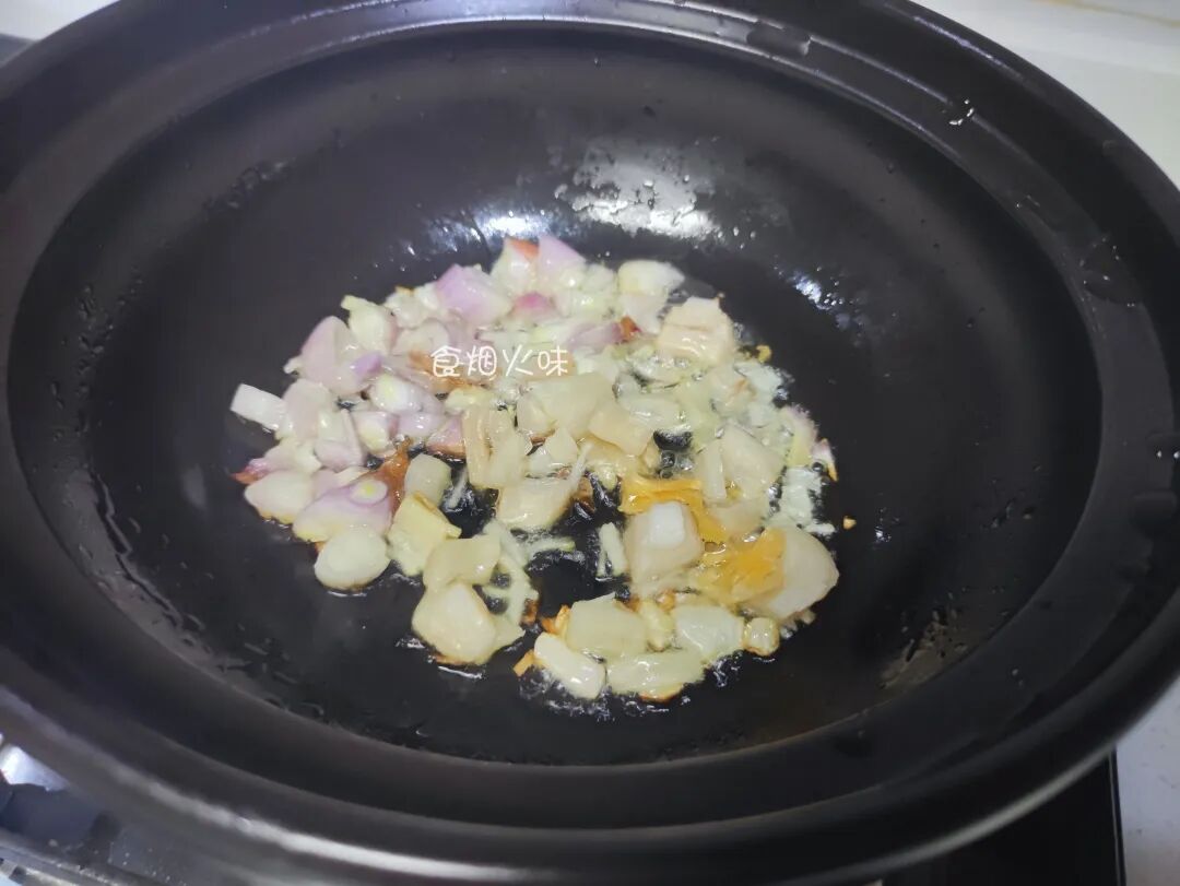 3.准备一个干净的锅,锅中的水分干后,倒入适量的油。锅中油热后,倒入葱头,干贝丝。开小火,用铲子将它们翻炒均匀,稍微经过煸炒,使葱头散发出香味;