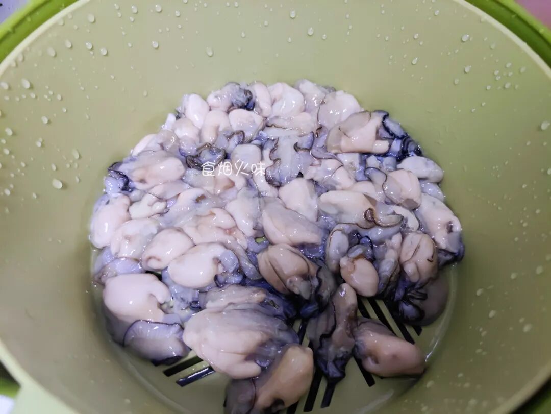 1.买回来的海蛎放在盆中,用清水将其稍微清洗一下,洗净后捞出放在一旁备用。海蛎的肚子很容易戳破,清洗的时候要注意点,不要用力抓。海蛎里面也会藏有海蛎壳,记得要将其挑出来;