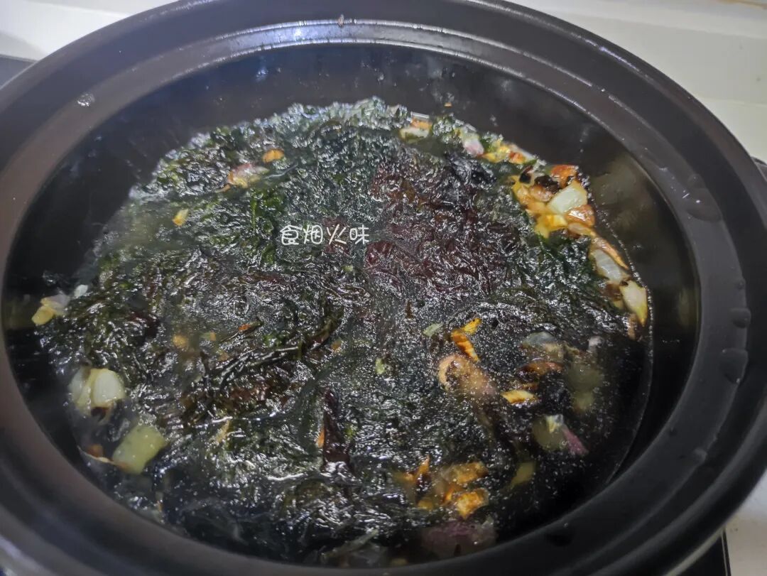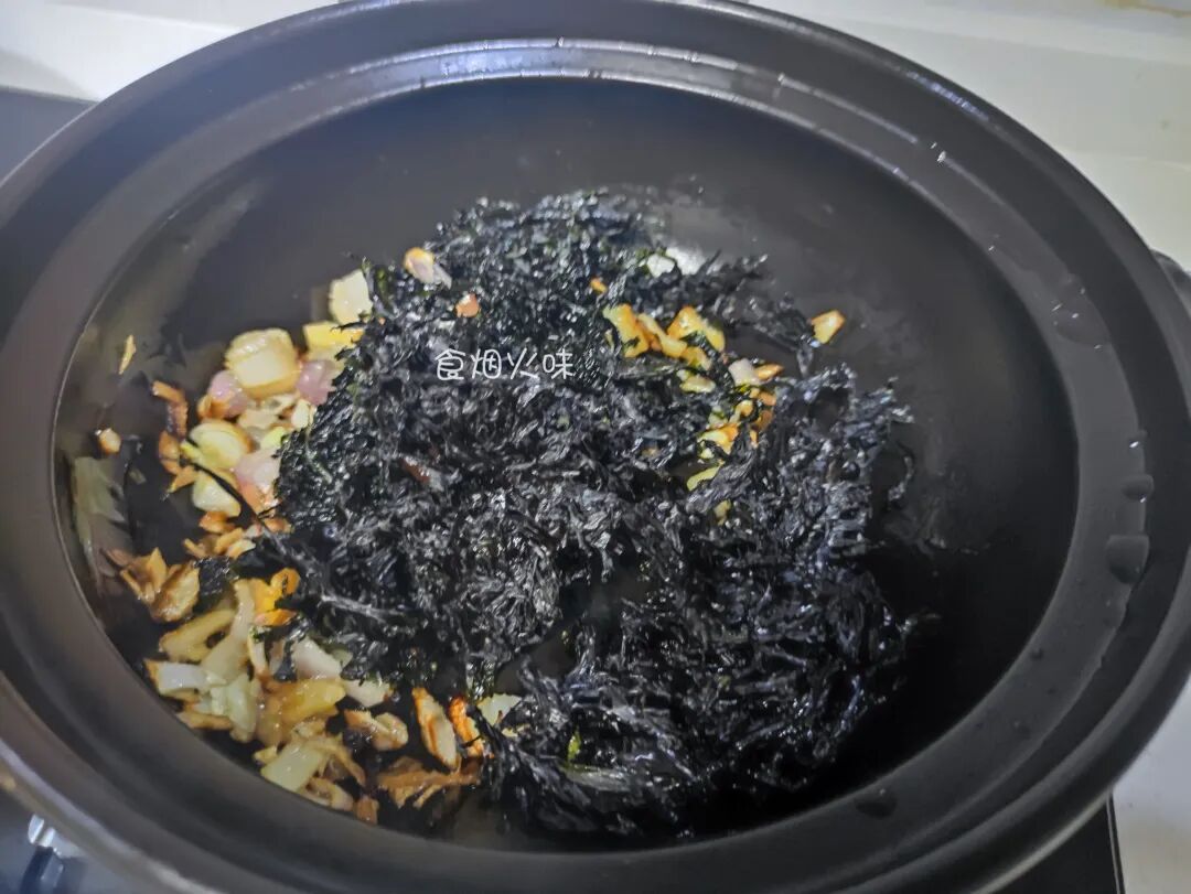 5.紫菜经过炒后,颜色会变深一点。里面加入适量的水,刚刚泡发干贝的水就可以一同倒入里面了。水的量就看自己的喜欢而添加,盖上锅盖进行焖煮;