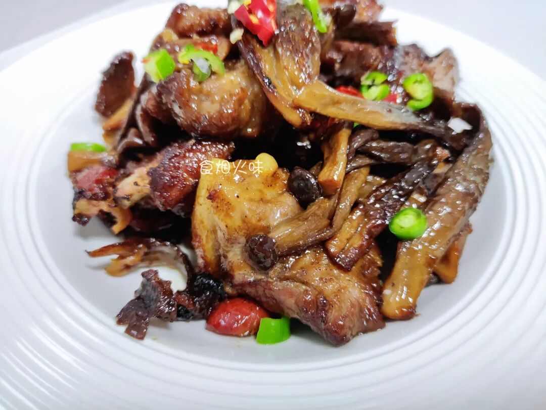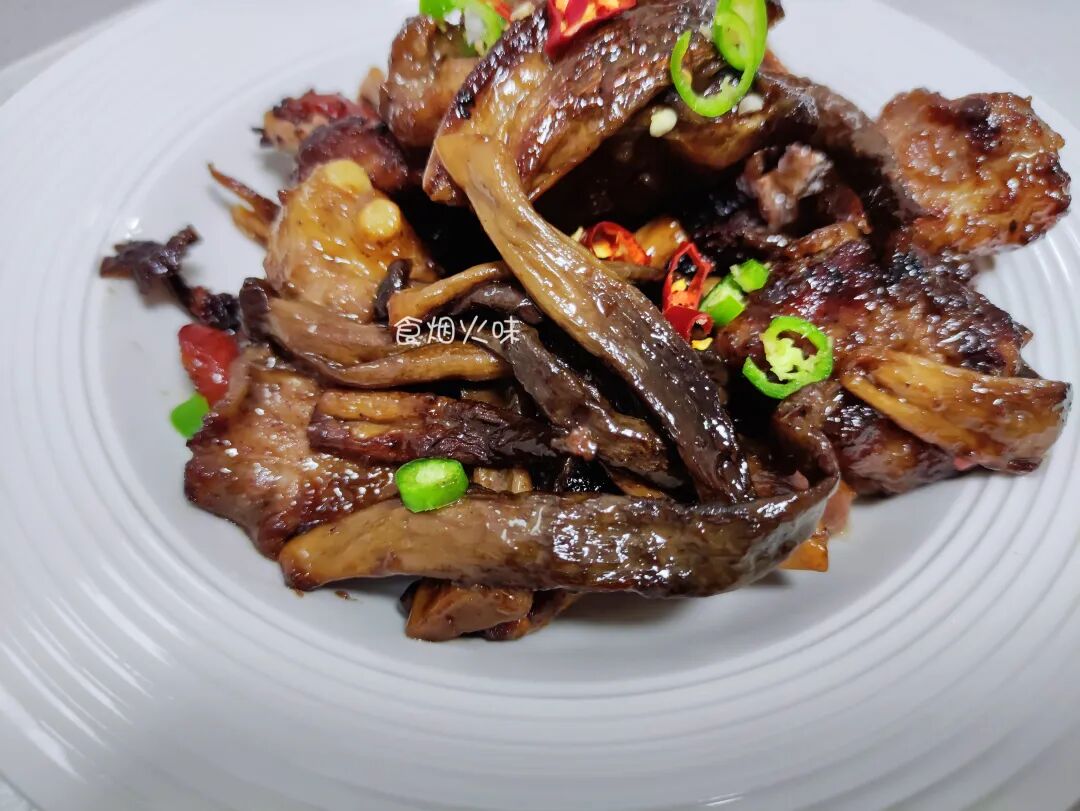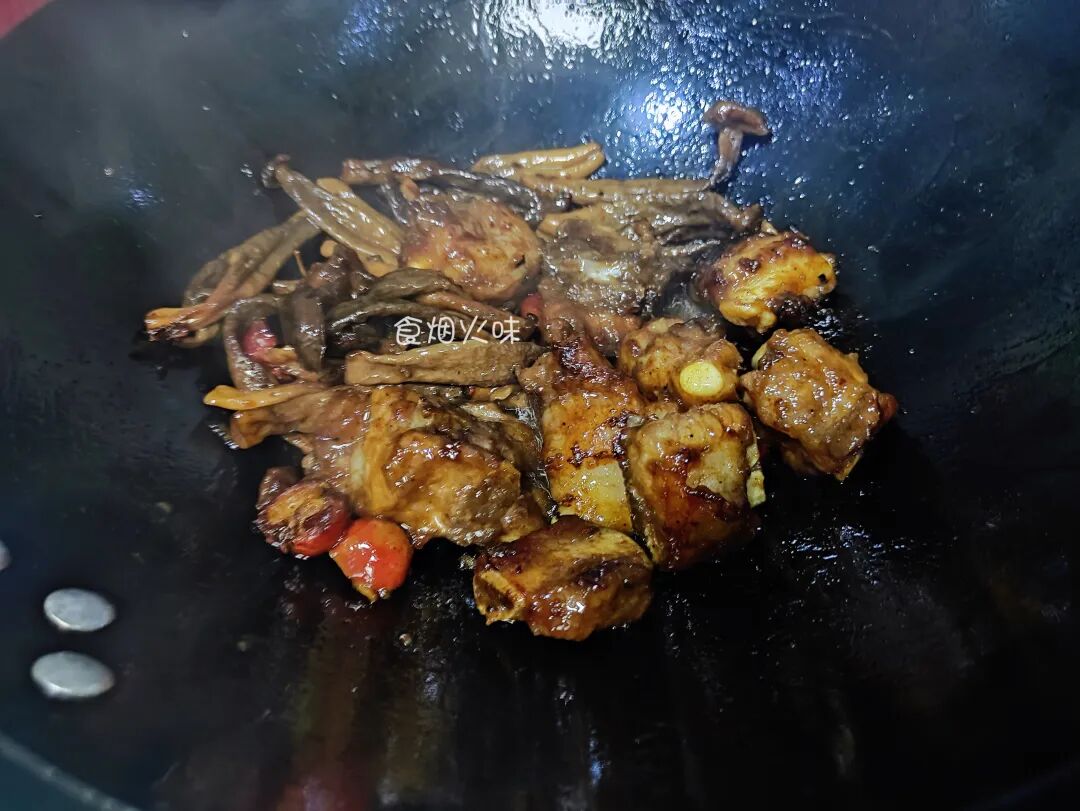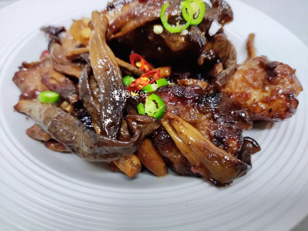 出锅后撒入青红辣椒,有着增香提味,还使得这道菜看起来更加诱人可口了。鹿茸菇吸收了排骨的汤汁,口感不再单调了,还有肉香味。而排骨融合了鹿茸菇的香味,味道更好。两种食材相互影响,相互作用,达到最好的状态。