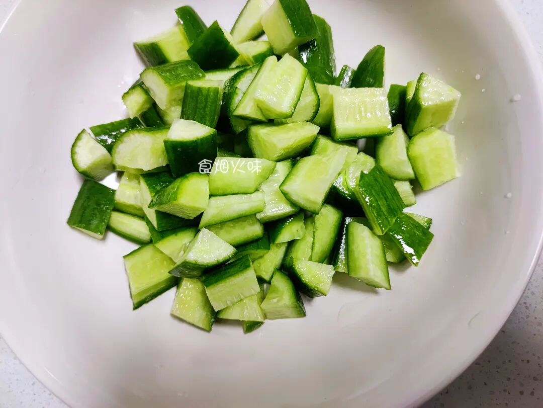 1.买回来的黄瓜放在盆中,手心抓一把食盐,用手来回搓洗黄瓜的表面。黄瓜的表面用食盐搓洗可以更好地杀菌消毒,然后放在清水中冲洗干净,洗净后的黄瓜放在案板上,用刀将它们切成小块,切好的黄瓜放在盆中备用;