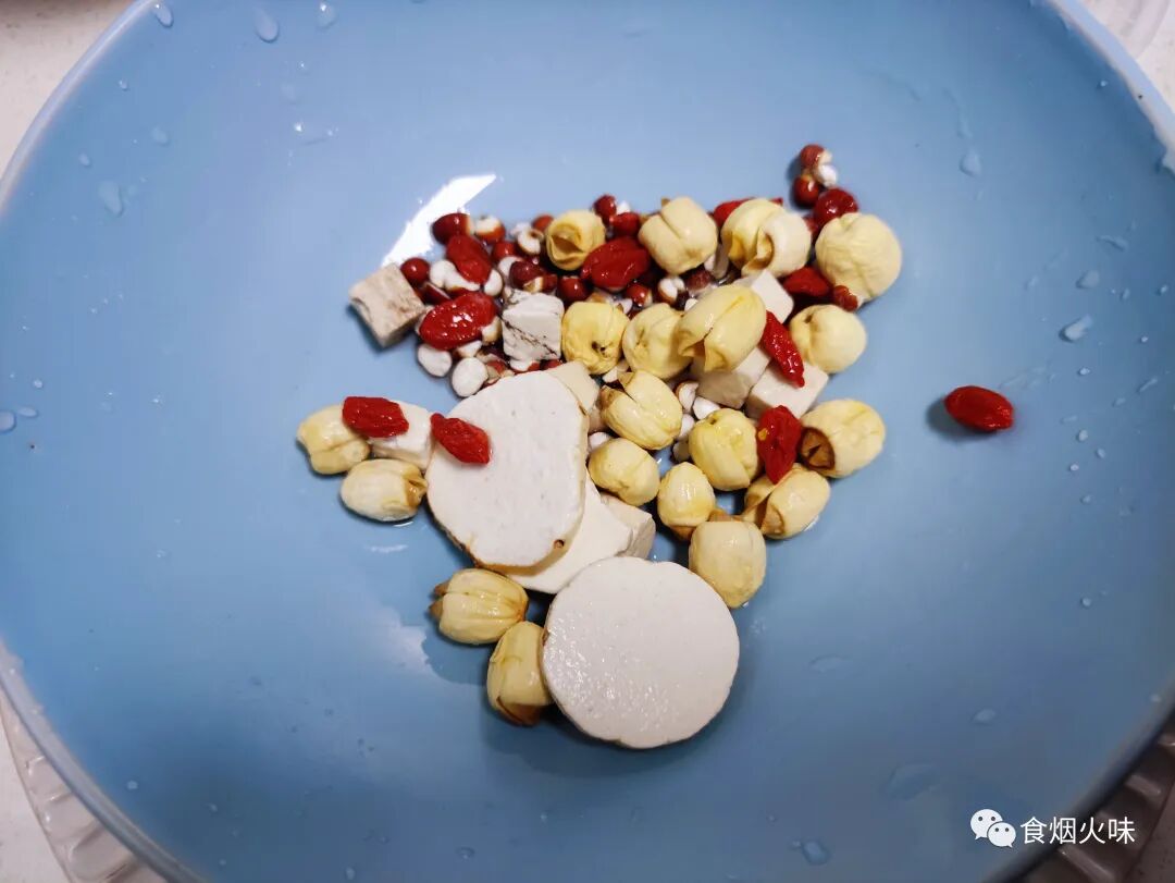 3.莲子,茯苓,淮山片,芡实,枸杞这5种食材放在盆中,放入适量的清水将它们冲洗干净,洗净后放在一旁备用;