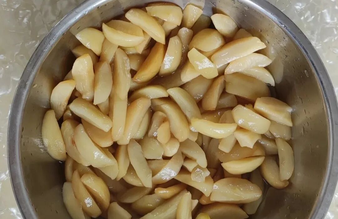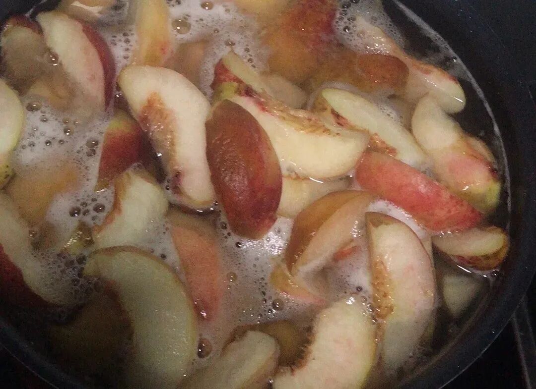3.桃子在白沙糖中浸泡后,会有水分生出来,这个要留着。准备一个干净无水无油无盐的锅,锅中的水分干后,将腌好的桃子连同汁水一同倒入锅中熬煮。桃子跟汁水经过在锅中煮5分钟左右,可以更好地吸收水分,可以有杀菌的好处;