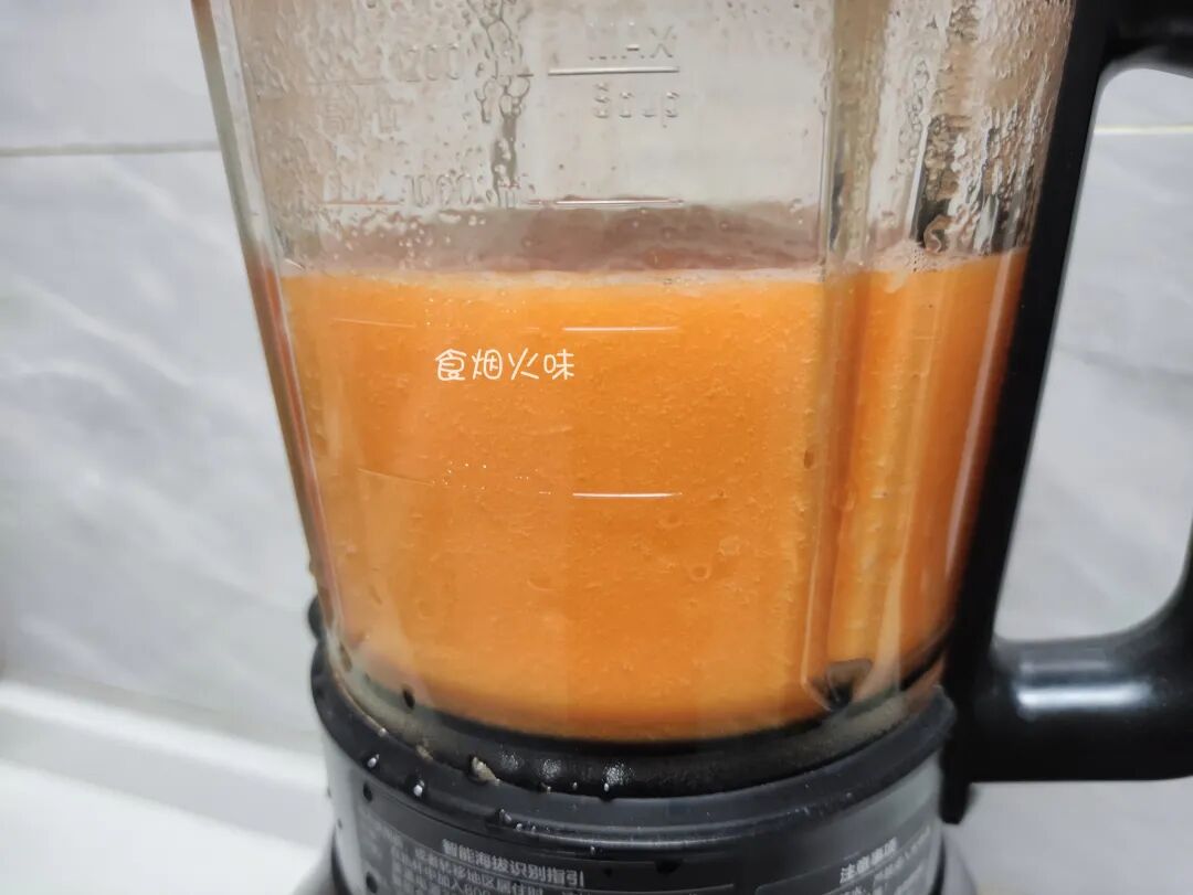3.食材放入后,盖上盖子。盖子一定要盖好,然后按下果汁的按键,3分钟就可以搞定了。做的过程中,可以看到里面果汁的颜色很漂亮,胡萝卜的黄,让人看着就心情愉悦。