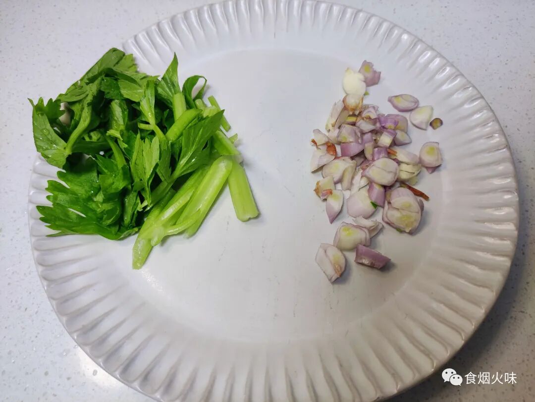 2.葱头表面的红皮去掉,然后清洗干净,洗净后的葱头放在案板上,用刀将它们切成细段,切好的葱头放在盆中备用。西芹的也要用清水洗净,特别是根部,记得用手搓洗,洗净后的西芹也是放在案板上,用刀将它们切成小段,切好后的西芹放在盆中备用;