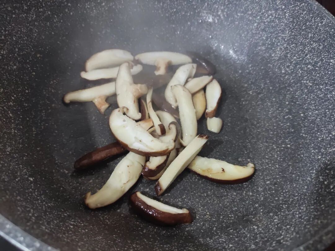 3.准备一个干净的锅,锅中的水分干后倒入适量的油,将切好的香菇倒入里面翻炒一下,炒后的香菇,倒入的水,盖上盖子将水煮开;