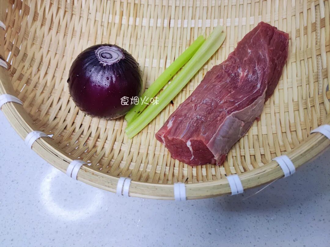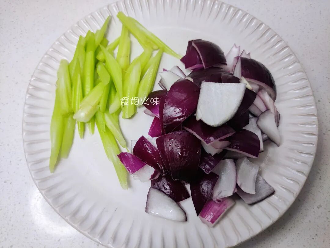 洋葱,西芹,牛肉,生姜,食盐,胡椒粉,淀粉,食用油,酱油,白糖,蚝油