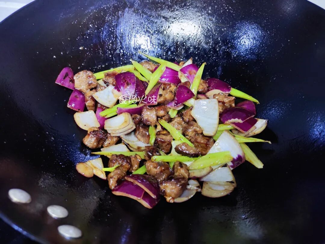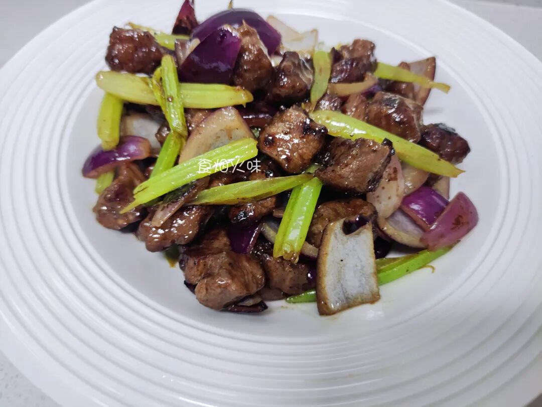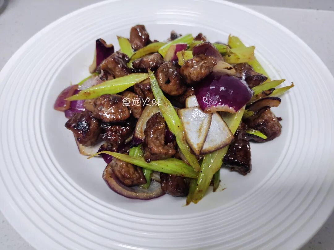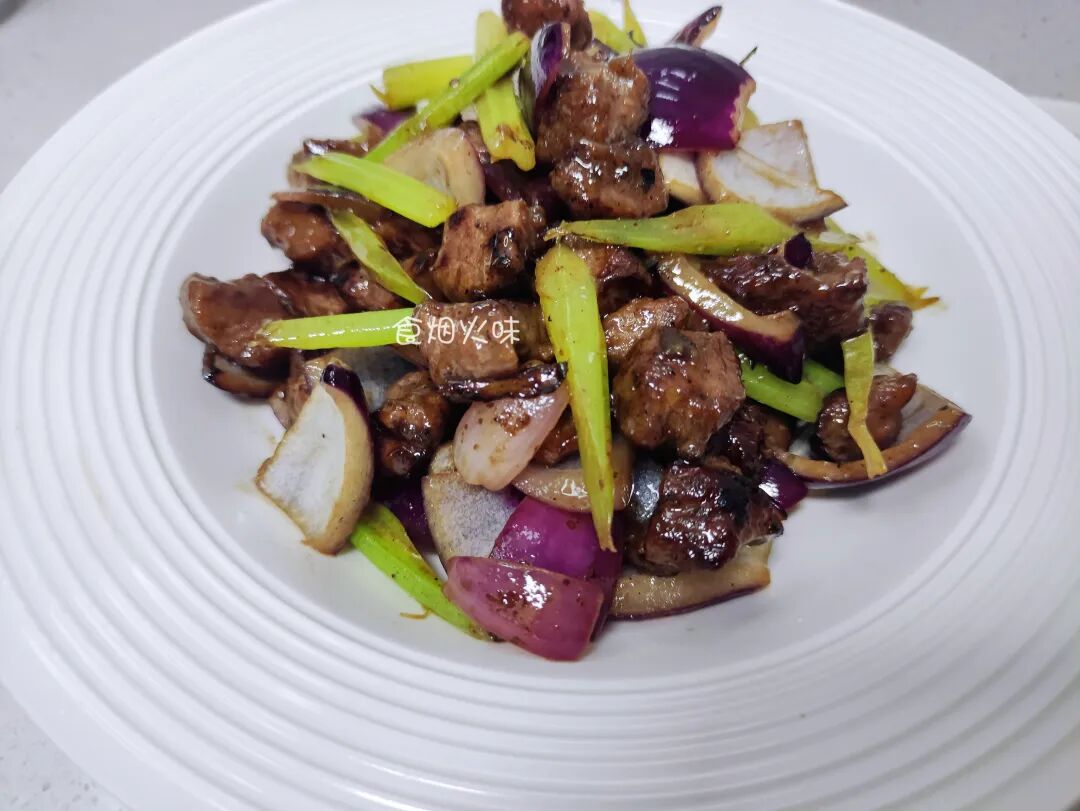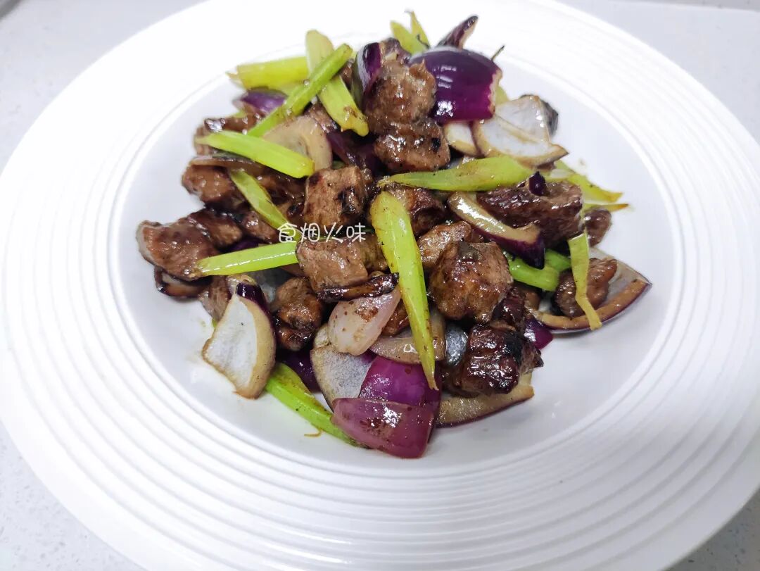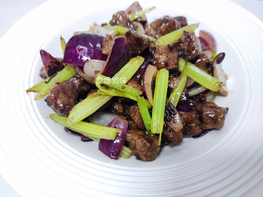 3.炒牛肉粒的时候加入西芹根,洋葱可以使色彩丰富,诱人可口,而且层次感非常丰富。