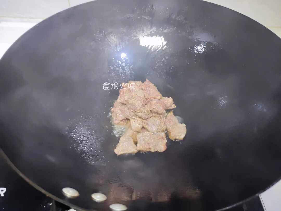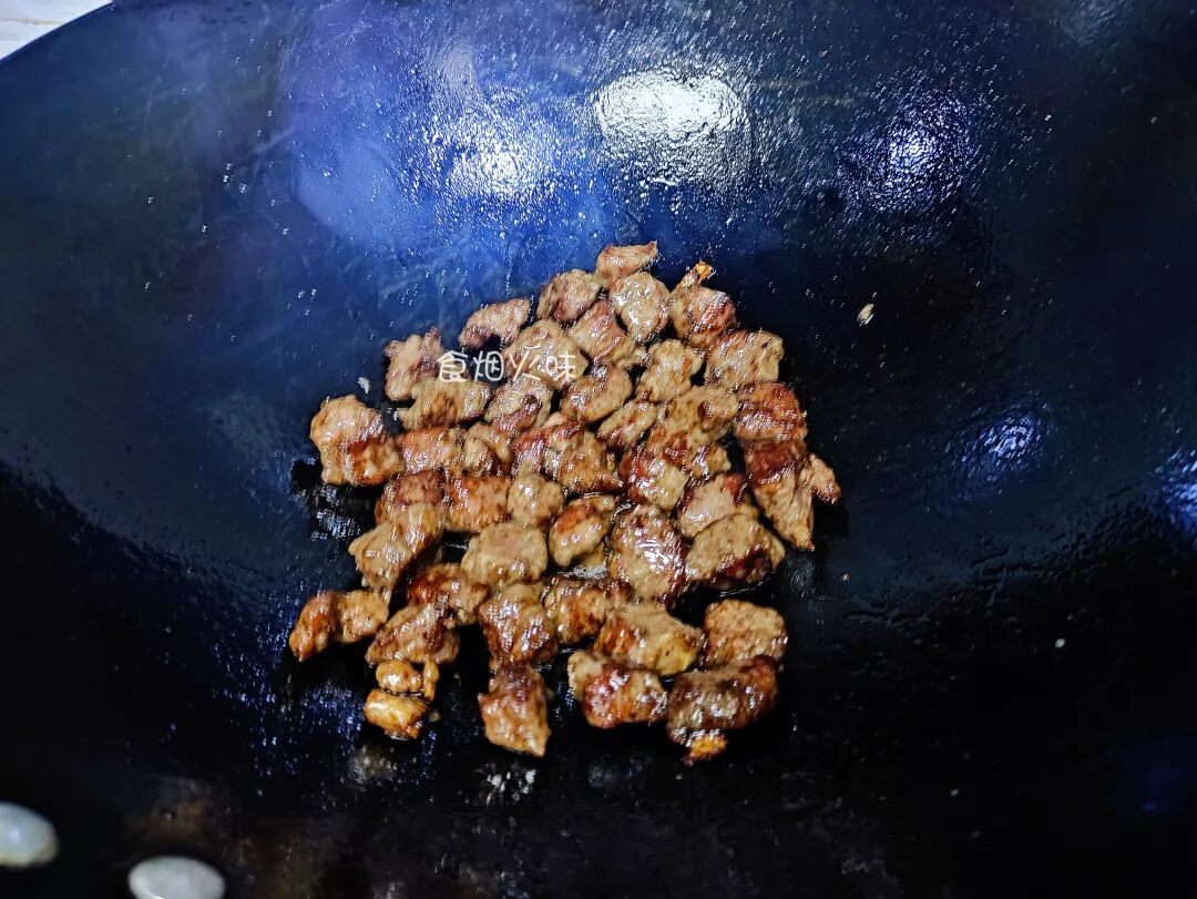 6.牛肉粒在锅中炒1~2分钟,炒至其变成这样两面焦焦的状态,也差不多七八分熟;