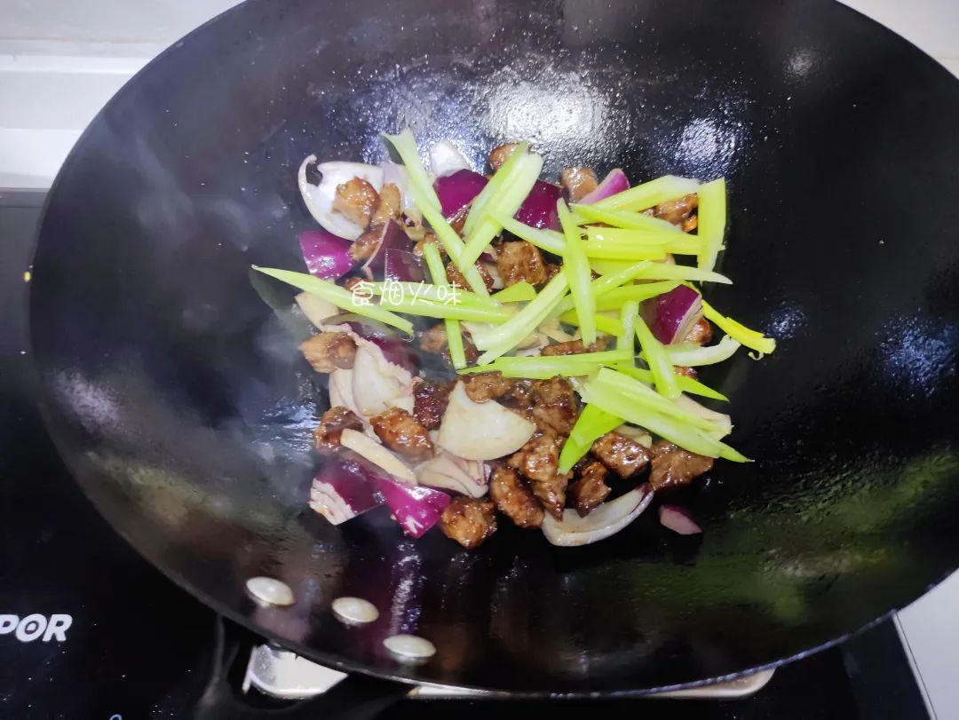 7.西芹跟洋葱块也倒入里面,用铲子将其翻炒均匀。西芹跟洋葱炒的时候也是比较容易熟,不用炒太久;