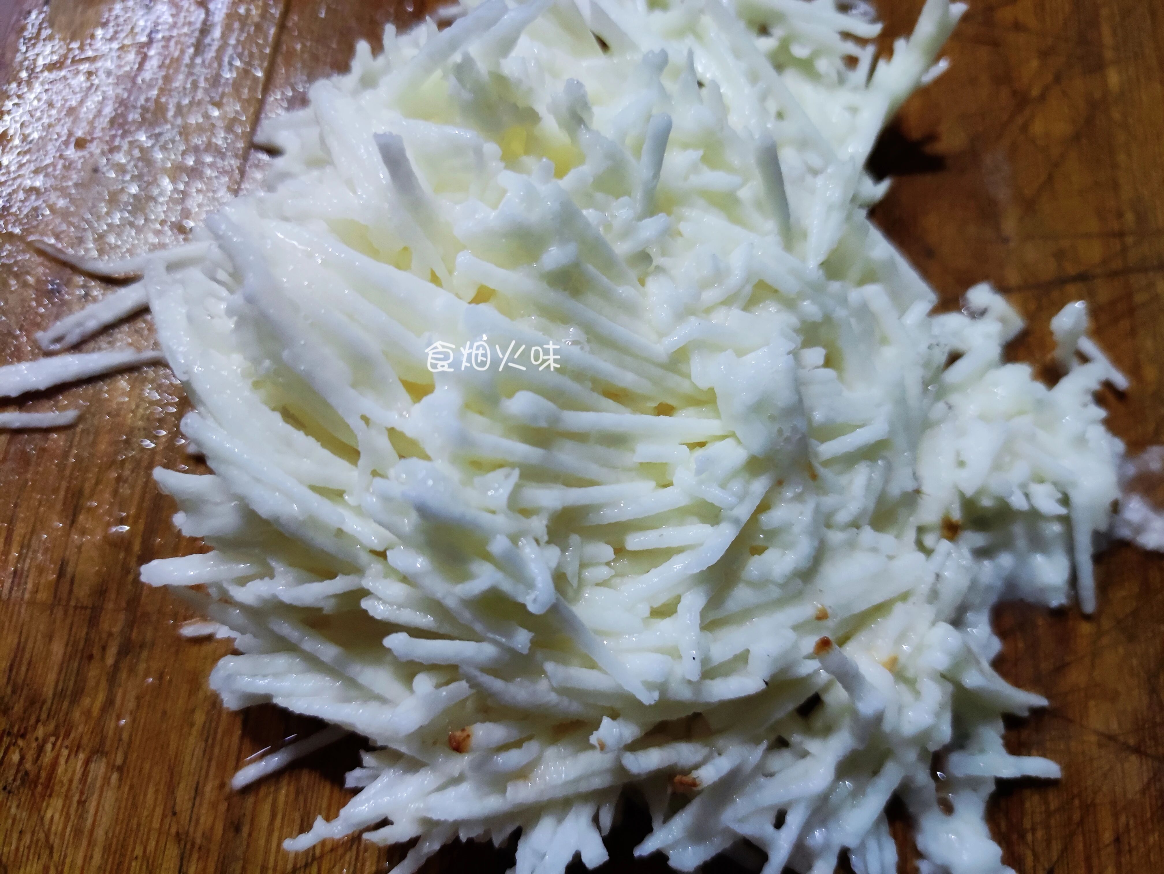 2.山药要擦成丝,剁成山药泥,尽可能地剁碎,做出来的味道好。