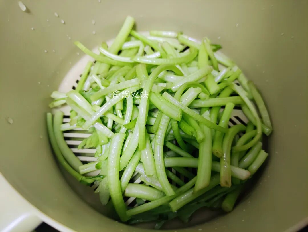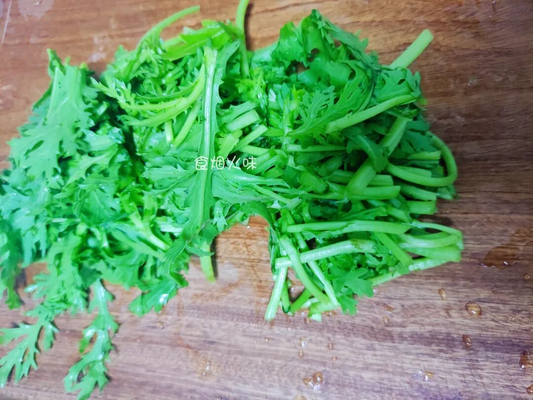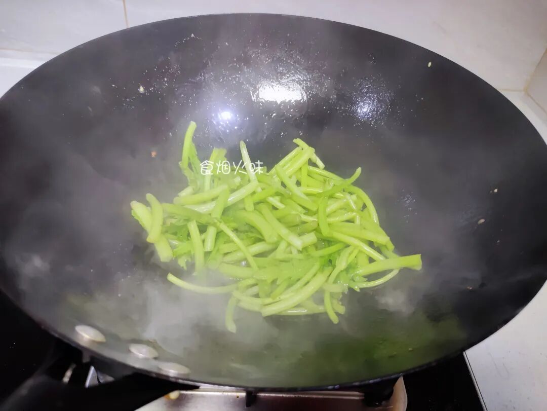 2.处理好后的茼蒿茎跟叶子要分开放,茼蒿茎要提前先下锅,先炒一会儿,这样炒出来的茎叶口感脆嫩鲜美好吃;