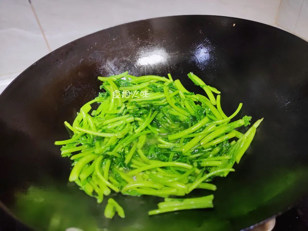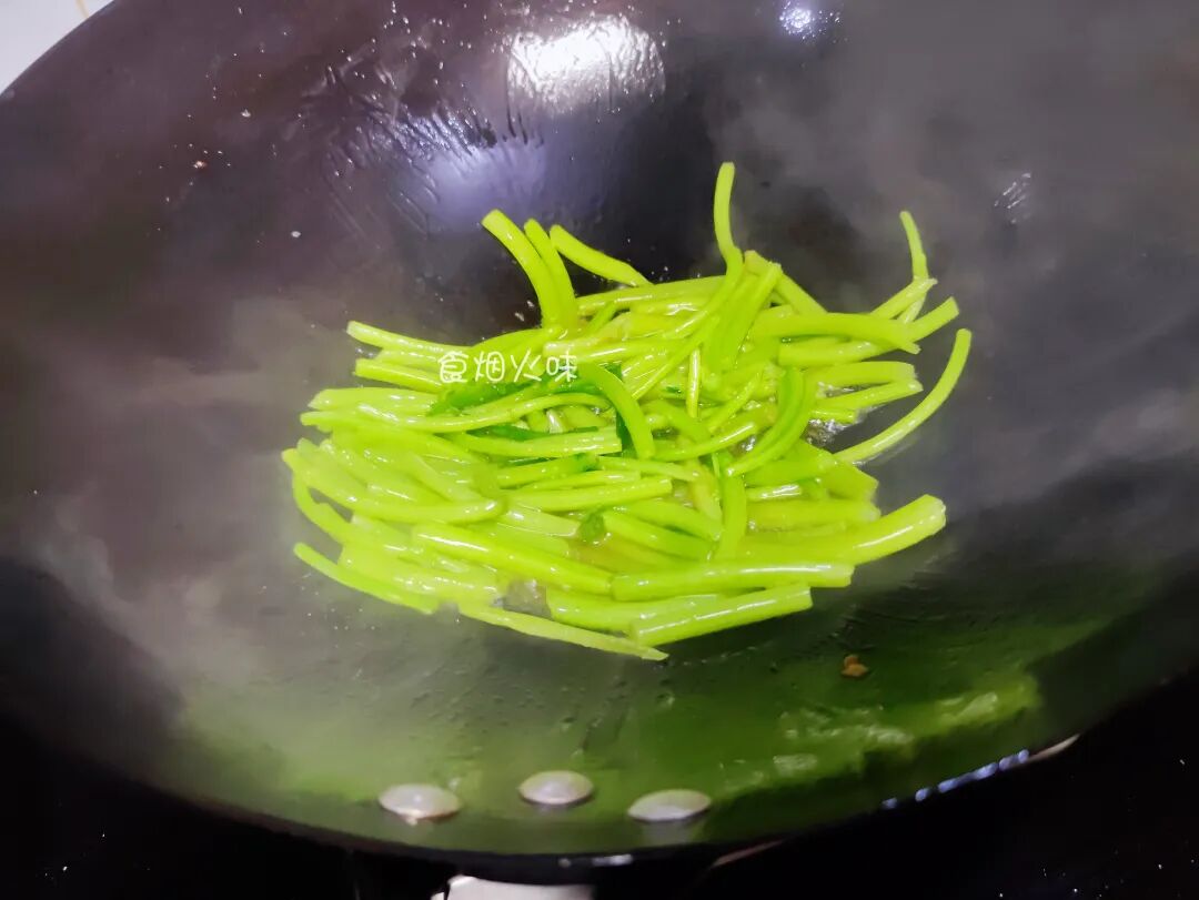4.锅中的茼蒿茎炒10来秒钟,它的颜色会变得比较翠绿,看起来特别有光泽;