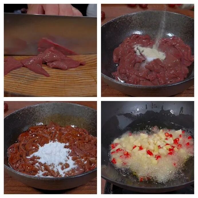 3、起锅热油,油温三成热,往里面加入姜、蒜、小米椒大火快速翻炒,爆出香味,再加入腌制好的猪肝,继续用大火翻炒至八成熟。