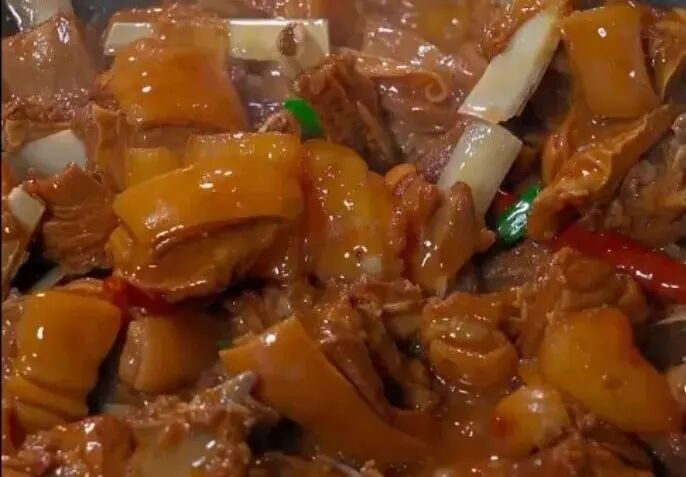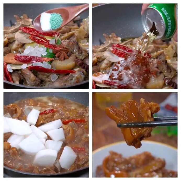 3、再加入几个干辣椒,几颗冰糖,盐、鸡精调味,生抽、老抽上色,蚝油提鲜、黄豆酱调味,一瓶啤酒去腥增香。