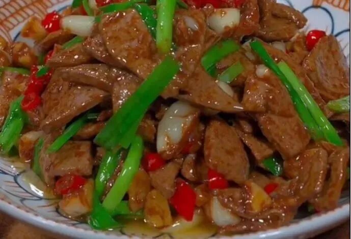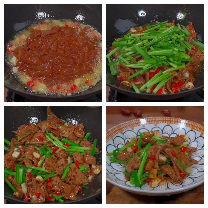 4、往锅中再加入一把韭菜段,继续翻炒,把猪肝炒入味以后,就可以出锅食用了,韭菜性温,与猪肝一同搭配后,不仅能调味,还能驱寒。