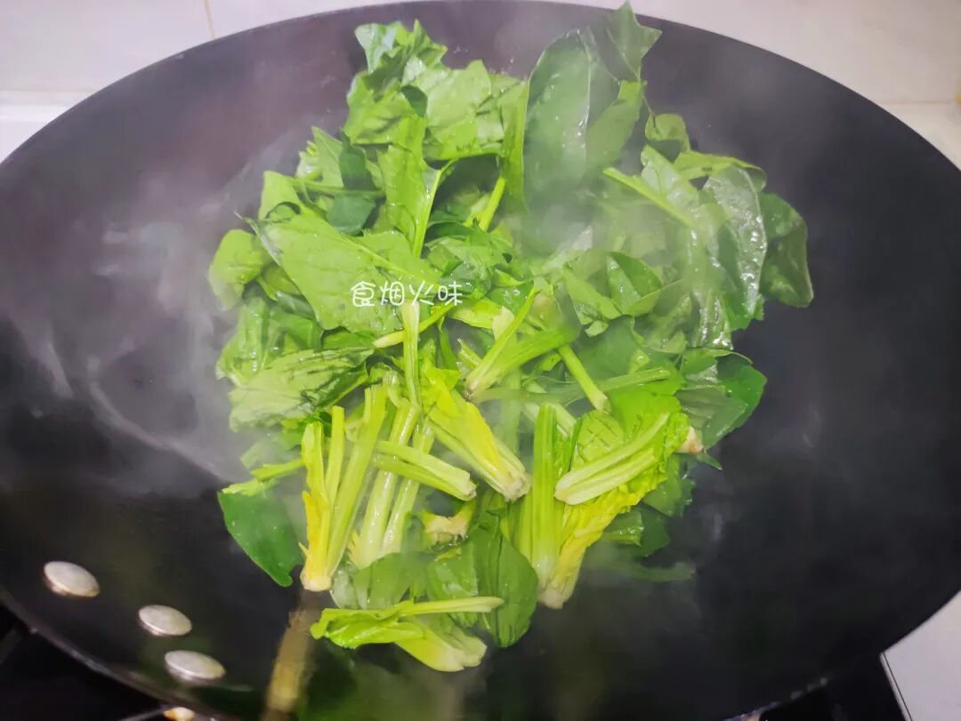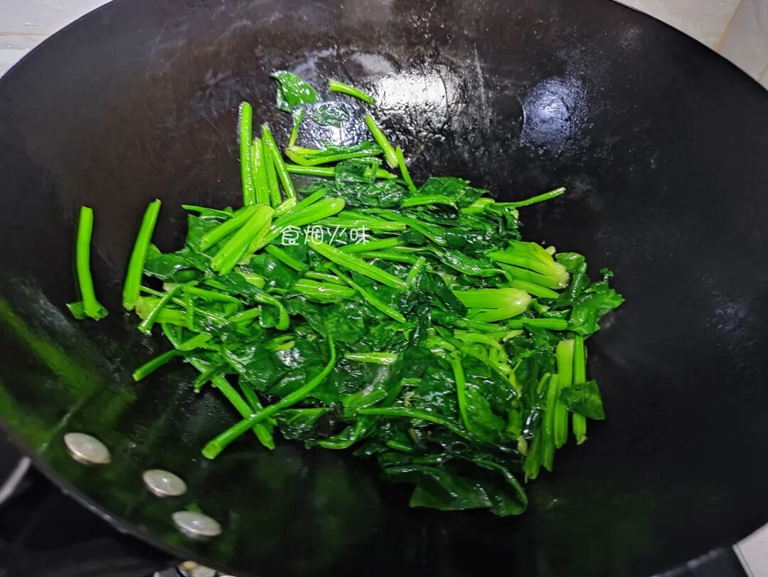3.炒菠菜的时候一定要翻动,防止里面的叶子粘合一起,这样炒出来不好吃口感差,而且加入食盐的时候容易成一坨,咸味没办法均匀;