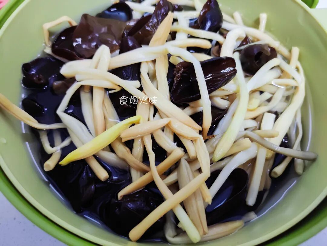 2.不着急煮的时候可以先将黄花菜根木耳放着浸泡2~3个小时。凉拌之前先放入锅中焯水一下。冷水下锅水开后再煮20秒即可。焯水后捞出放在冷水中过凉一下,口感会更加爽脆鲜美;