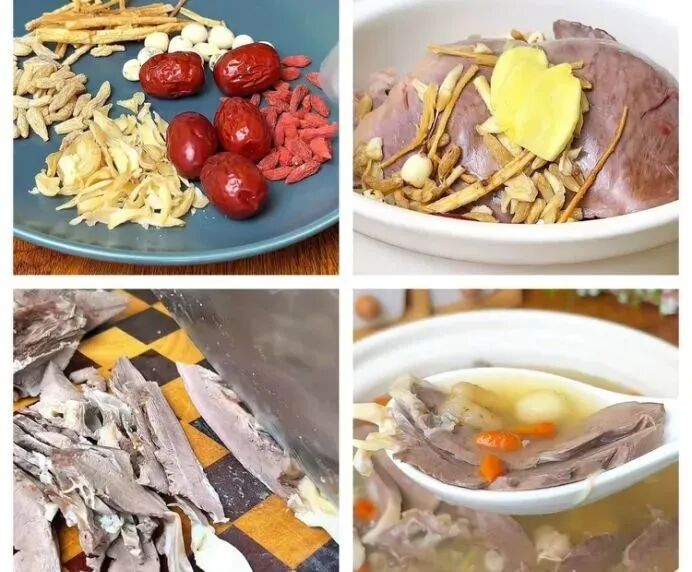 3、往锅中再加入干百合适量,几片姜片、一勺料酒、一大碗清水盖上盖子,小火煲上40分钟。时间到了以后,把猪心取出切片,再加入汤中煮开后,加盐、枸杞调味,汤鲜又味美很好喝,还助眠。