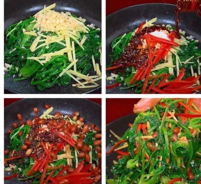 菠菜、盐、红椒丝、蒜末、姜丝、辣椒油、花生米