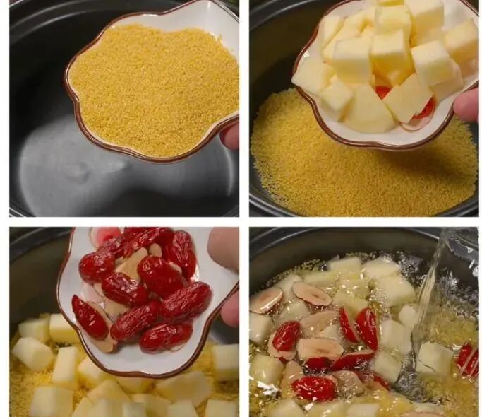 1、准备砂锅,往里面放入200克的小米,然后再准备一个苹果切块后,也加入砂锅中,最后再准备几个红枣,去壳切块,也加入砂锅中。