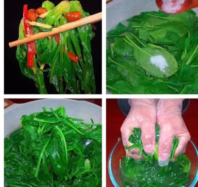 1、适量菠菜加入热水中,并加少许盐和食用油,焯水去除其内部的草酸,大概15秒后,把菠菜捞出,再挤干它内部的水分。