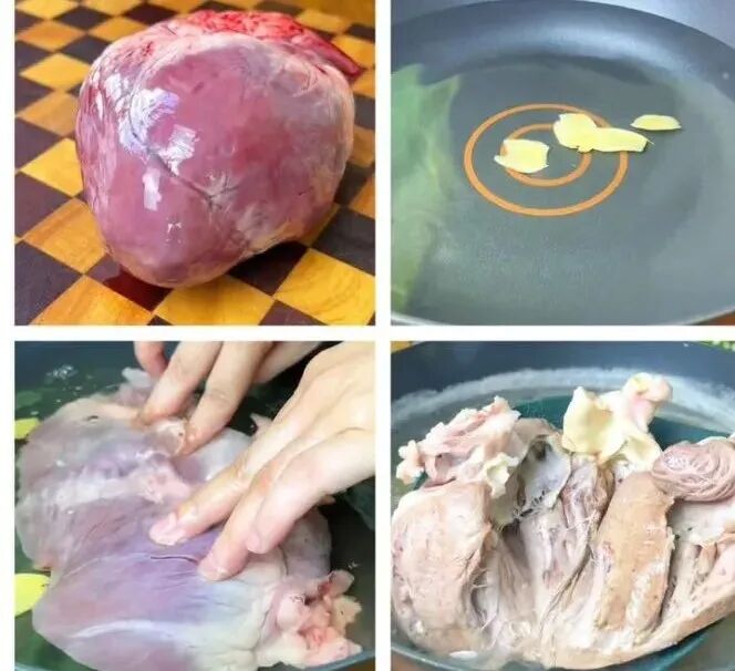 1、准备一个猪心,把它对半切开,再用清水冲洗掉内部血水,然后冷水加热,再加姜片适量,给它焯水一下,去除血沫后捞出。