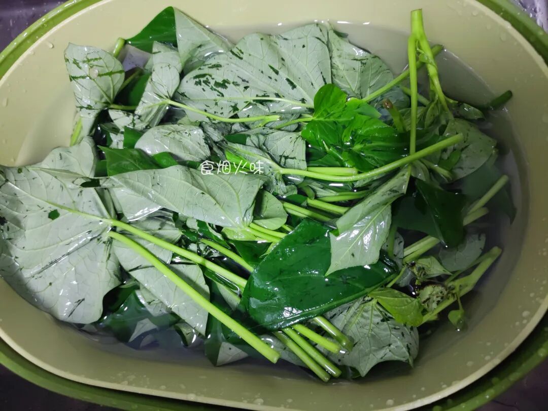1.准备好的地瓜叶要先放在水中清洗干净,地瓜叶长的靠近土的地方,所以比较会有杂质,一定要清洗干净;