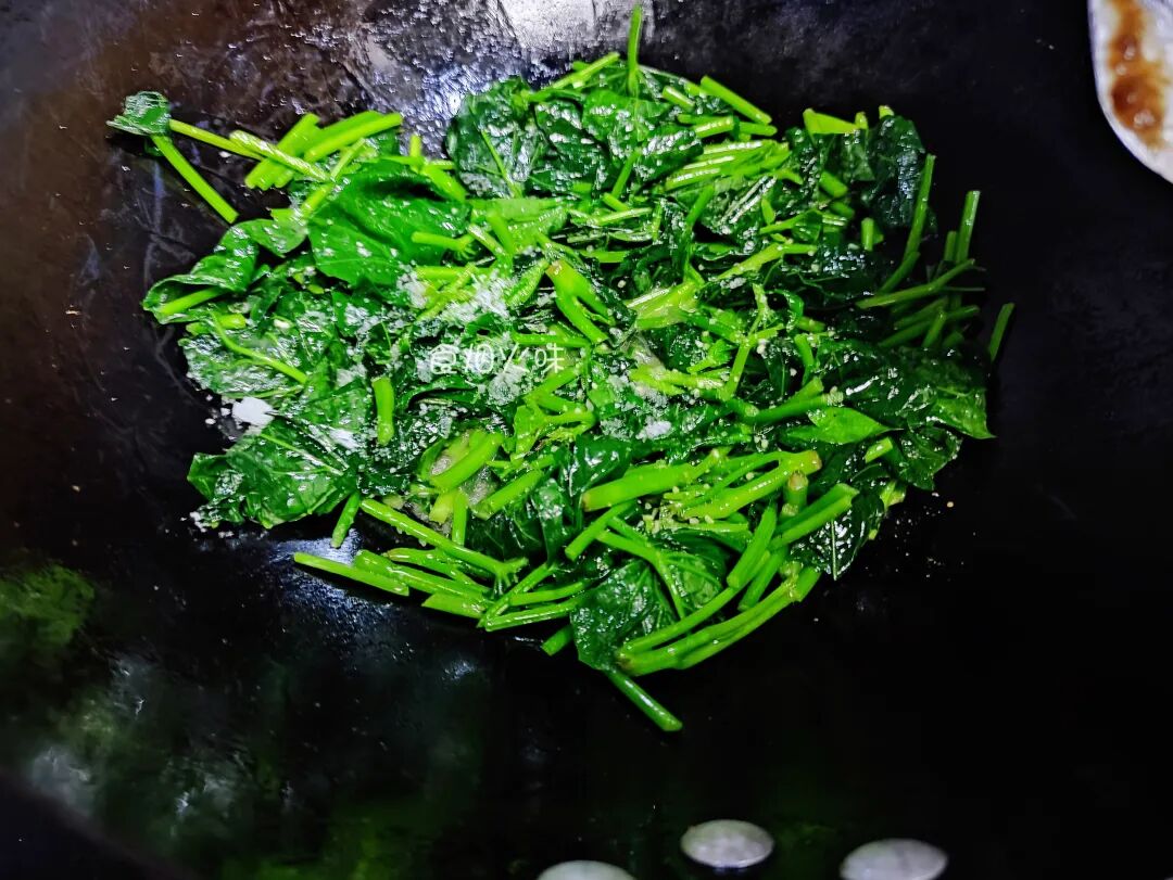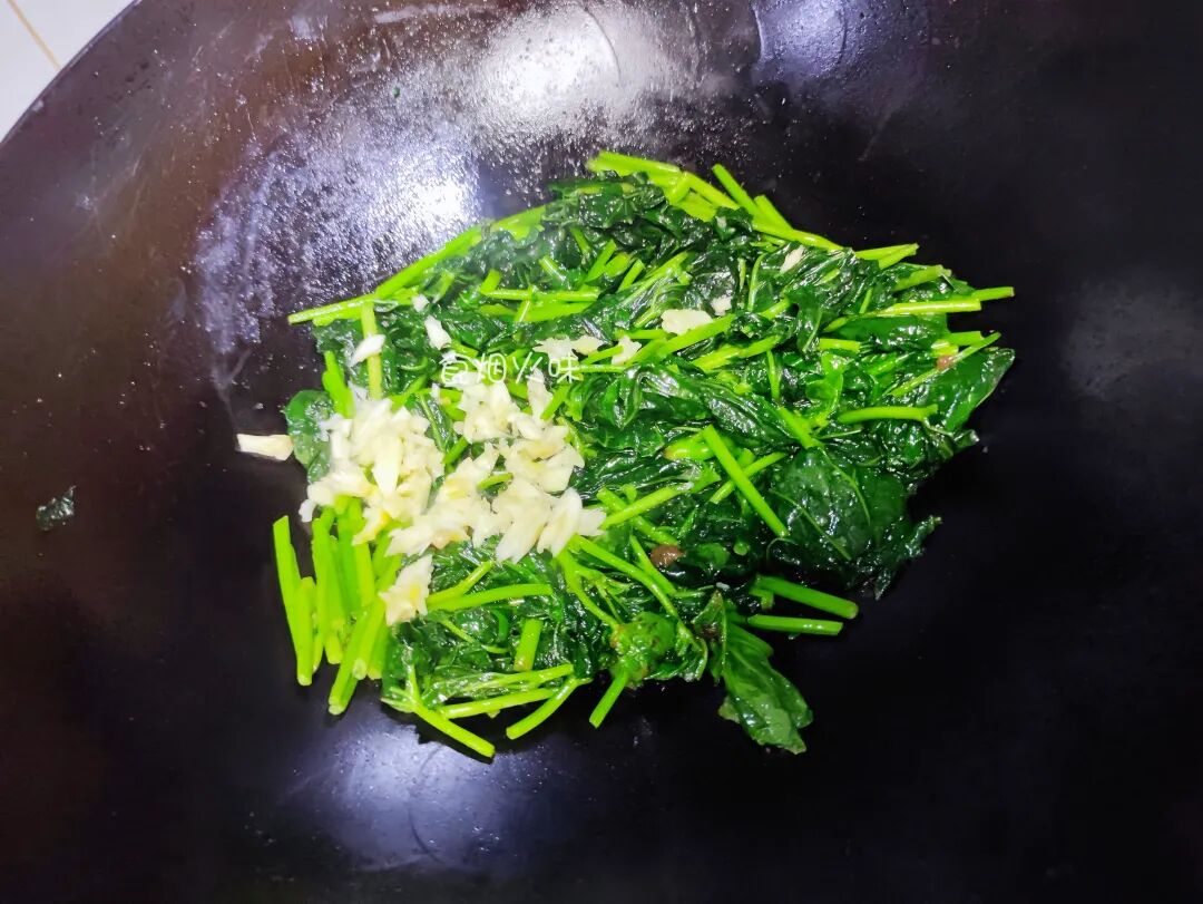 4.地瓜叶经过翻炒很快就会发软,变成非常脆绿,颜色很好看。我们将准备好的蒜泥倒入里面,加入适量的食盐,鸡精,用铲子将其翻炒均匀;