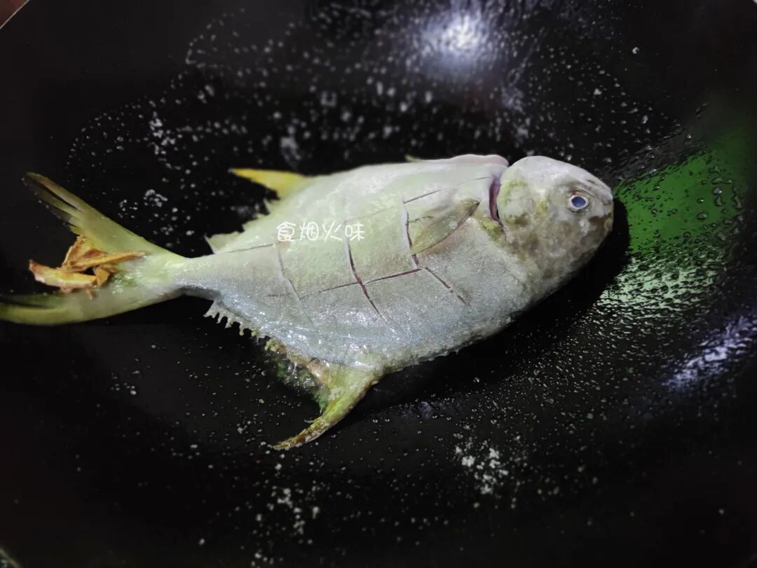5.将锅中的金鲳鱼煎至两边都金黄脆皮,就像下图这种状态就可以翻个面。如果我们不太确定的也可以晃动锅身,锅中的鱼会自由晃动则说明,煎煮的火候够了;