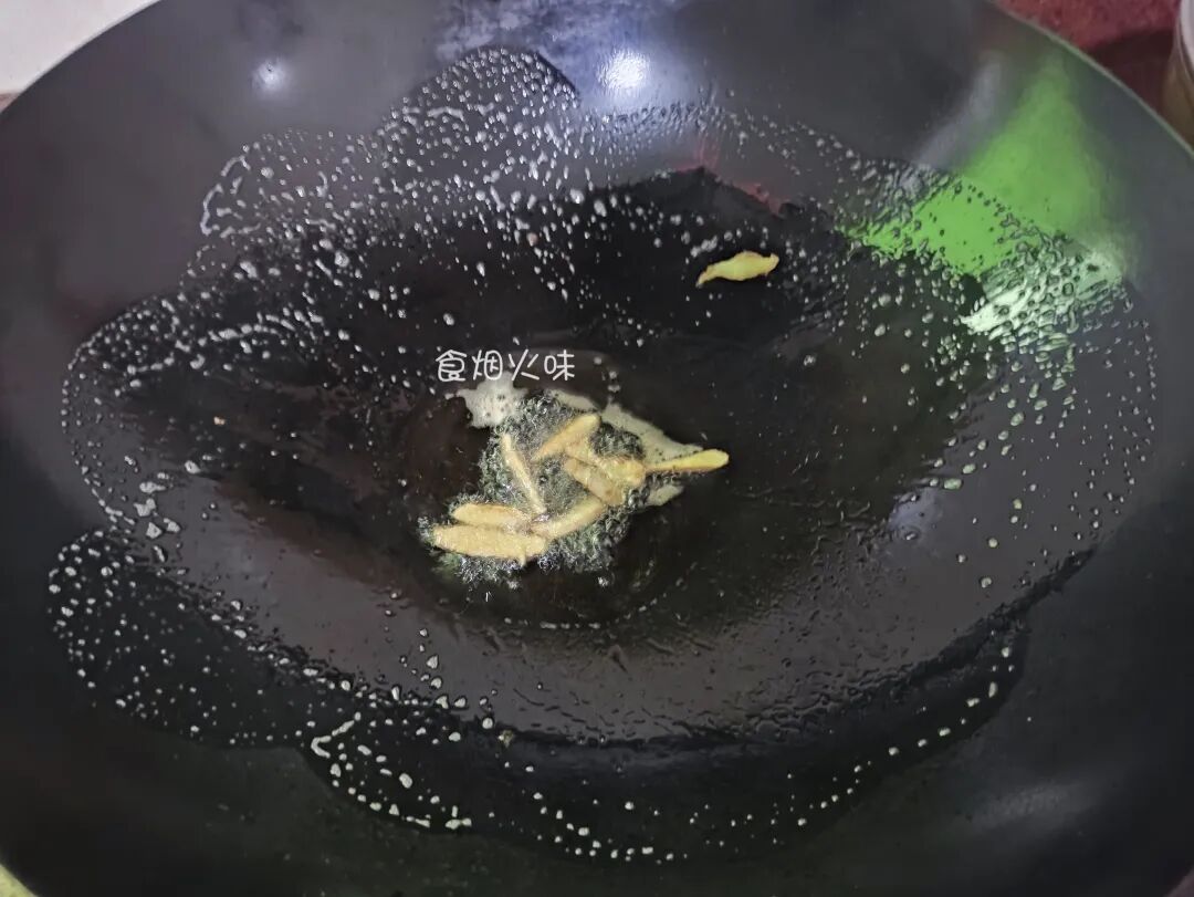 3.热锅中加入适量的油,将切好的生姜片放入油锅中煸炒出香味来。加入生姜增鲜提味。