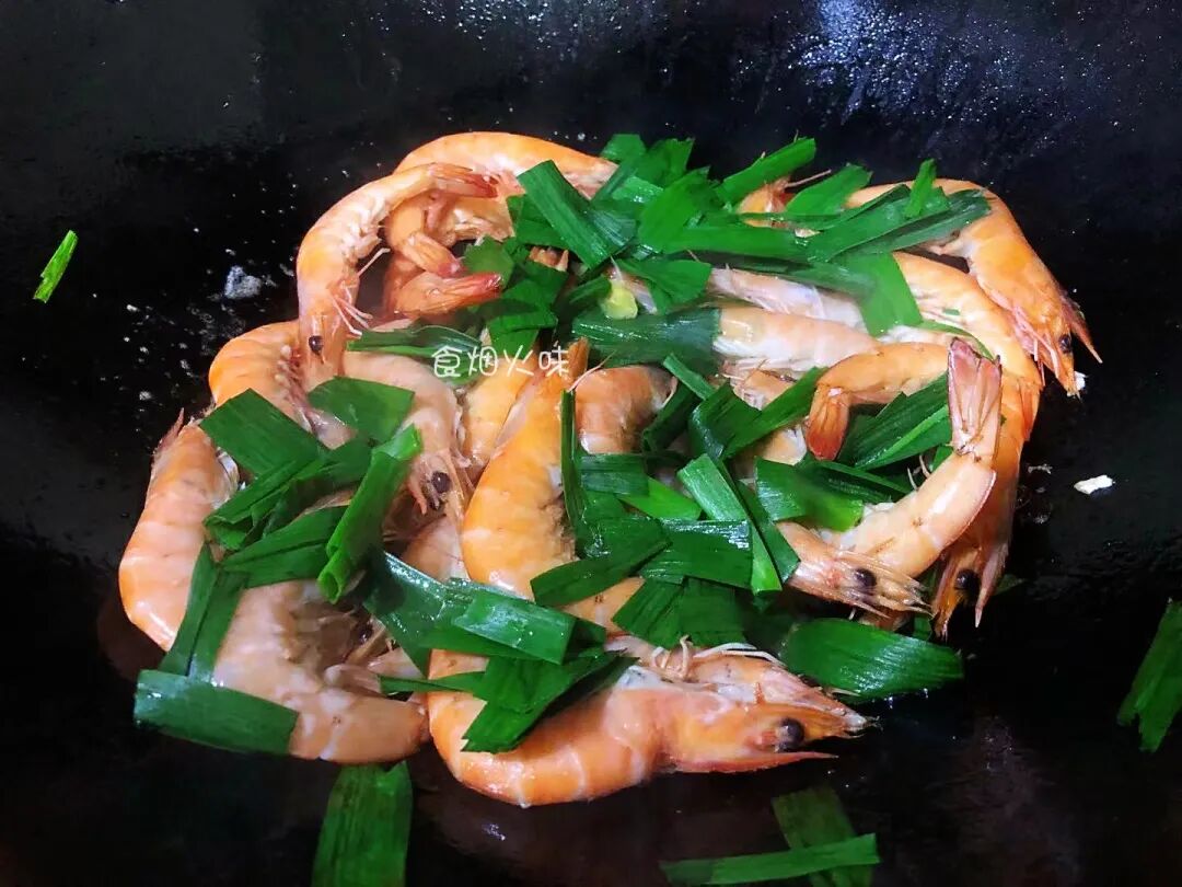 7.撒入蒜叶后,盖上盖子焖煮8-10分钟左右。焖煮的过程中不要翻动,防止鲜味散失掉。焖煮的时间到后,开锅后,锅中的大虾变成红色了,还能闻到一股浓浓的鲜香味,真是鲜甜。