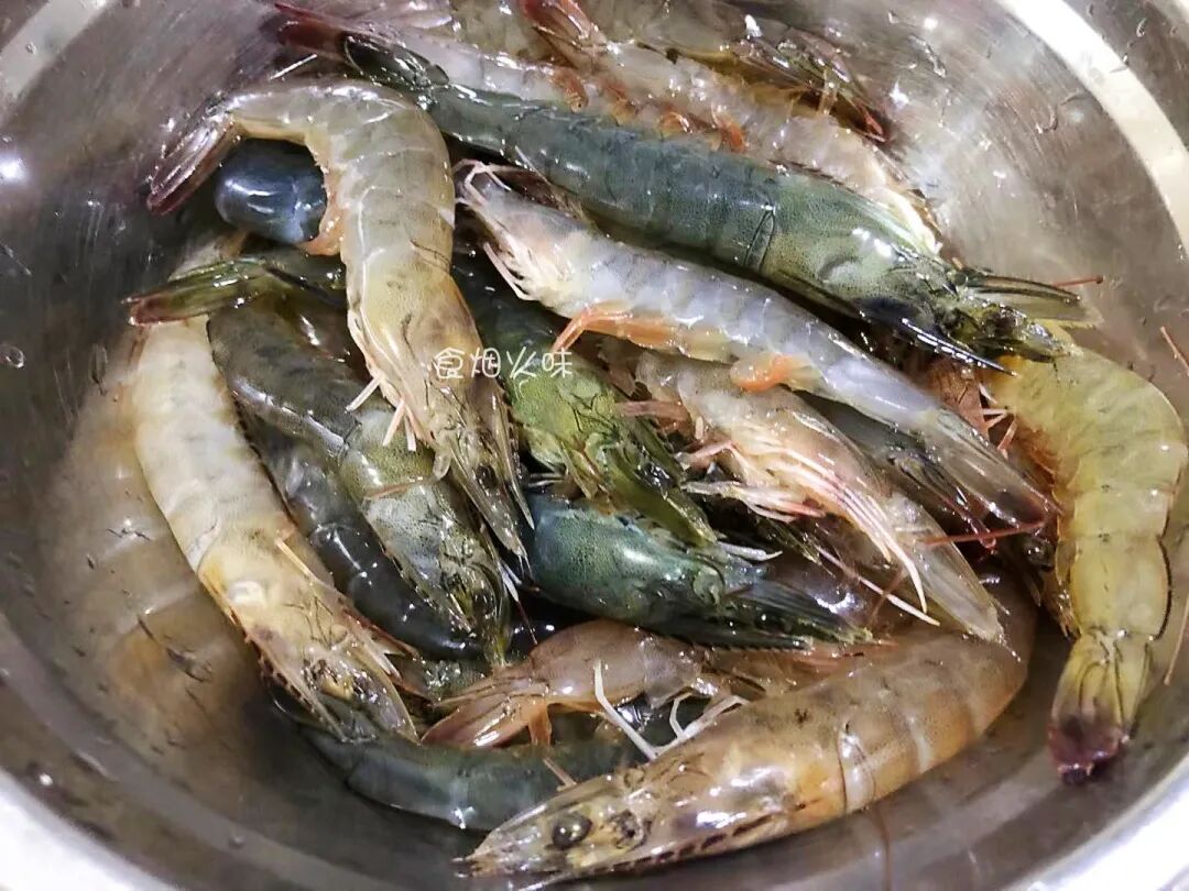 1.大虾中的虾线去掉后,煮出来又鲜又美,没有任何的腥味。去掉虾线的大虾再用清水洗净,随后捞出沥干水分。