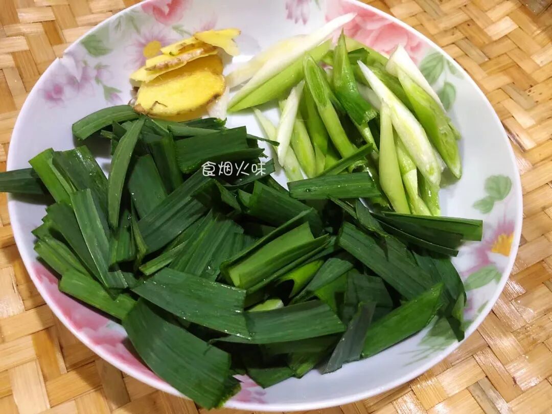 2.生姜的表面用清水冲洗干净,大蒜的黄叶去掉放水中洗净。洗净的生姜放在案板上将其切成细片,大蒜的蒜白斜着切成细段,蒜叶切细分开放在盆中。