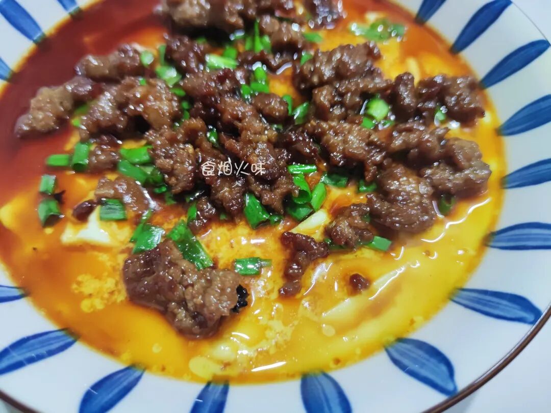 14.将准备好的牛肉酱汁倒入葱花上,热油的刺激使其味道更香鲜。