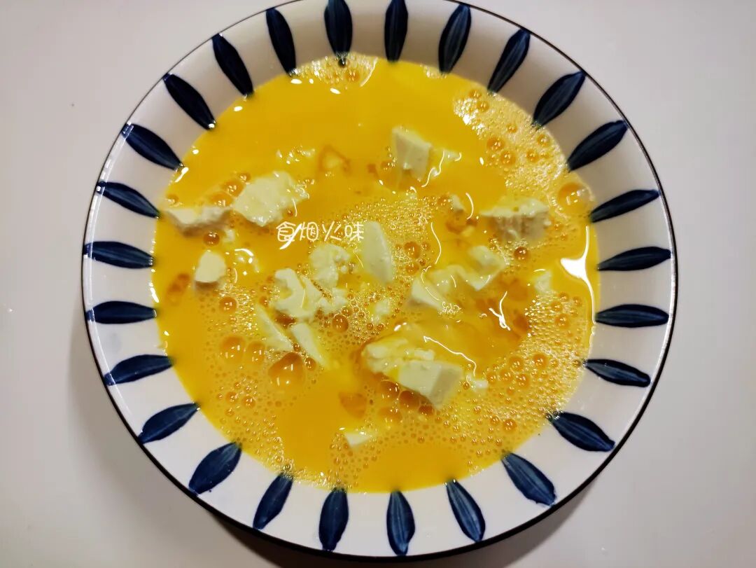 6.弄好的鸡蛋液倒入装豆腐的碗中,轻轻晃动下。