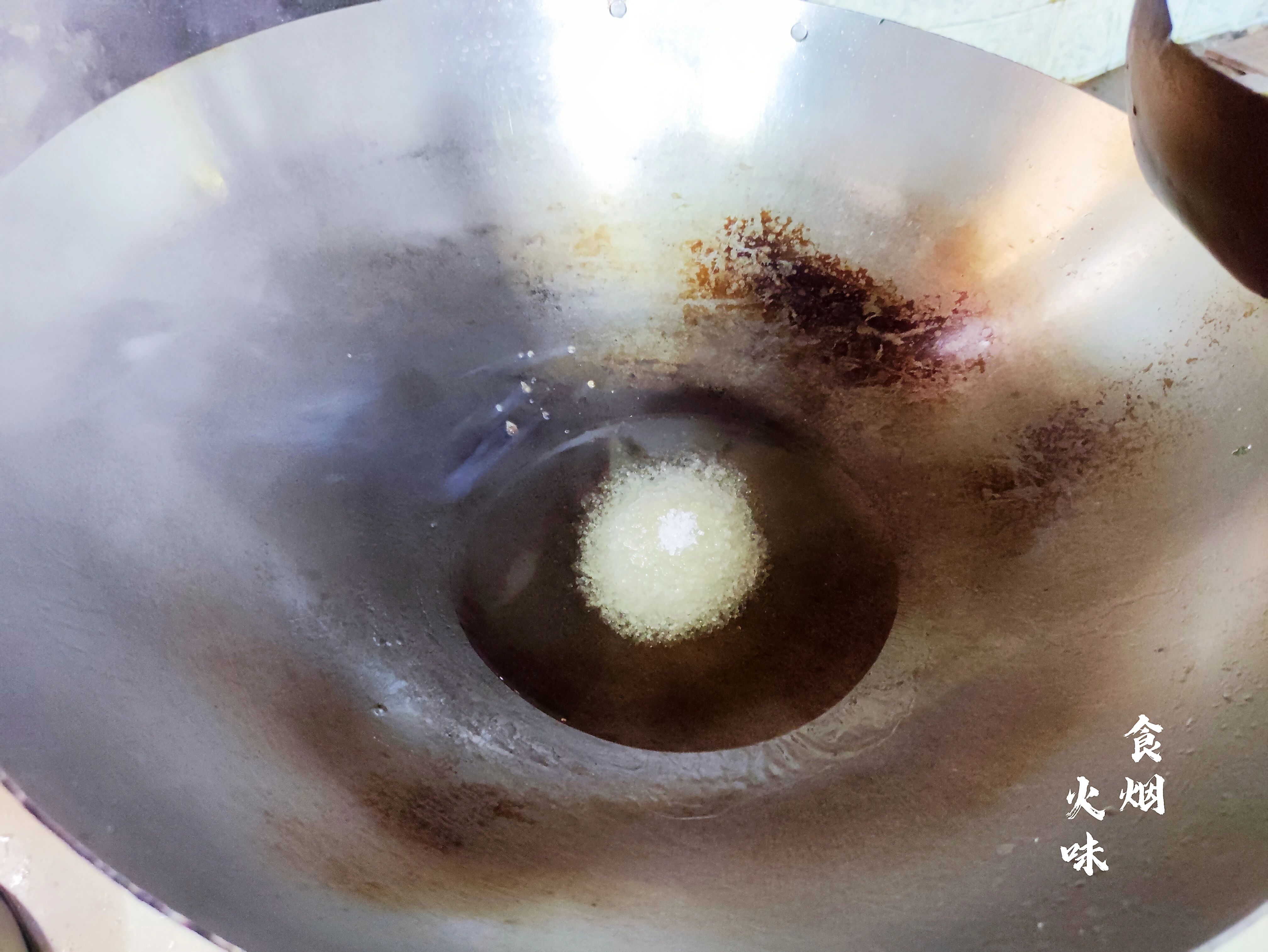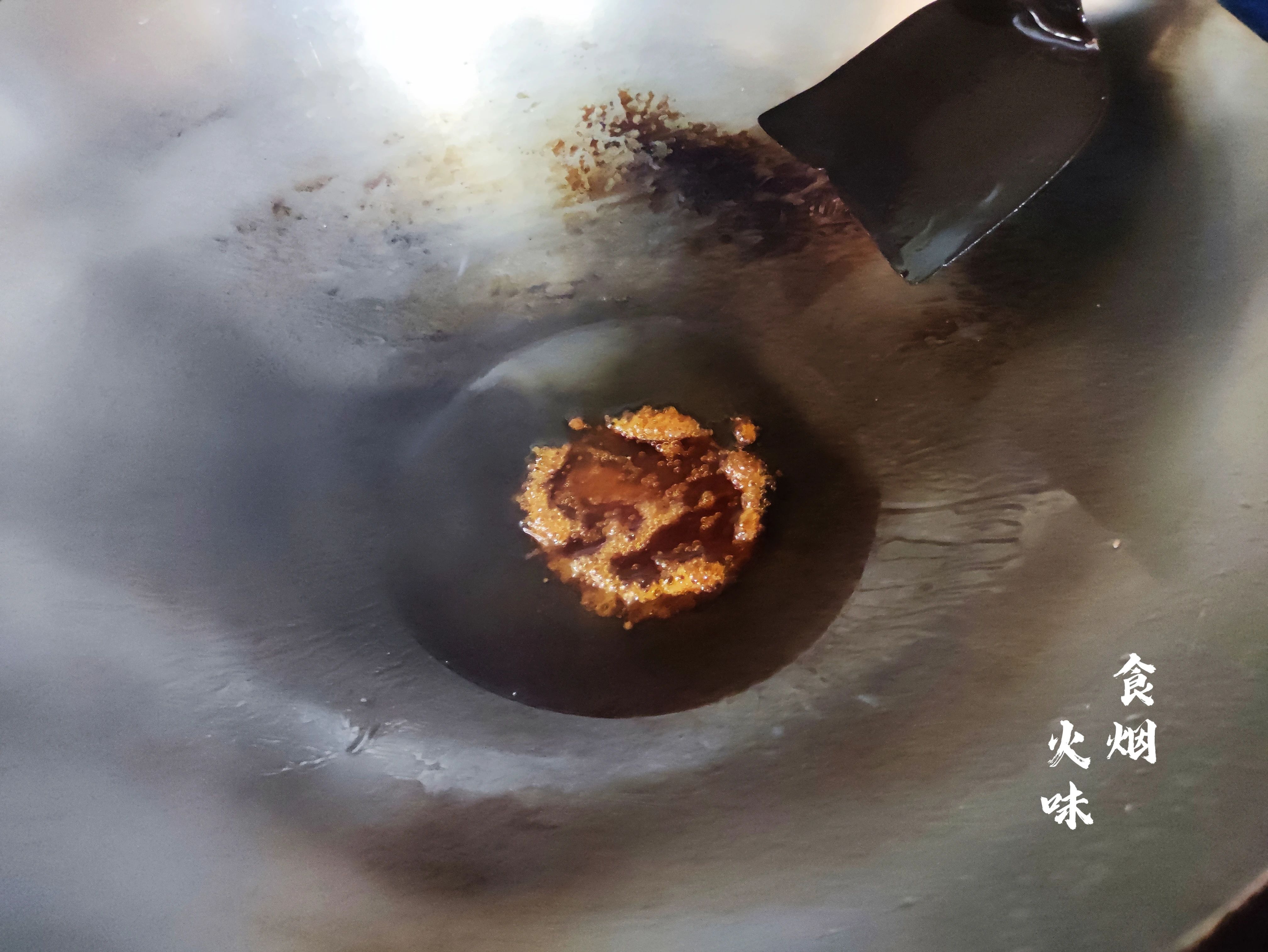 4.白糖倒入油锅中,要用铲子不停搅动这样白糖不容易煮焦。锅中的白糖煮至这样焦黑,还有点冒泡泡的状态就可以。