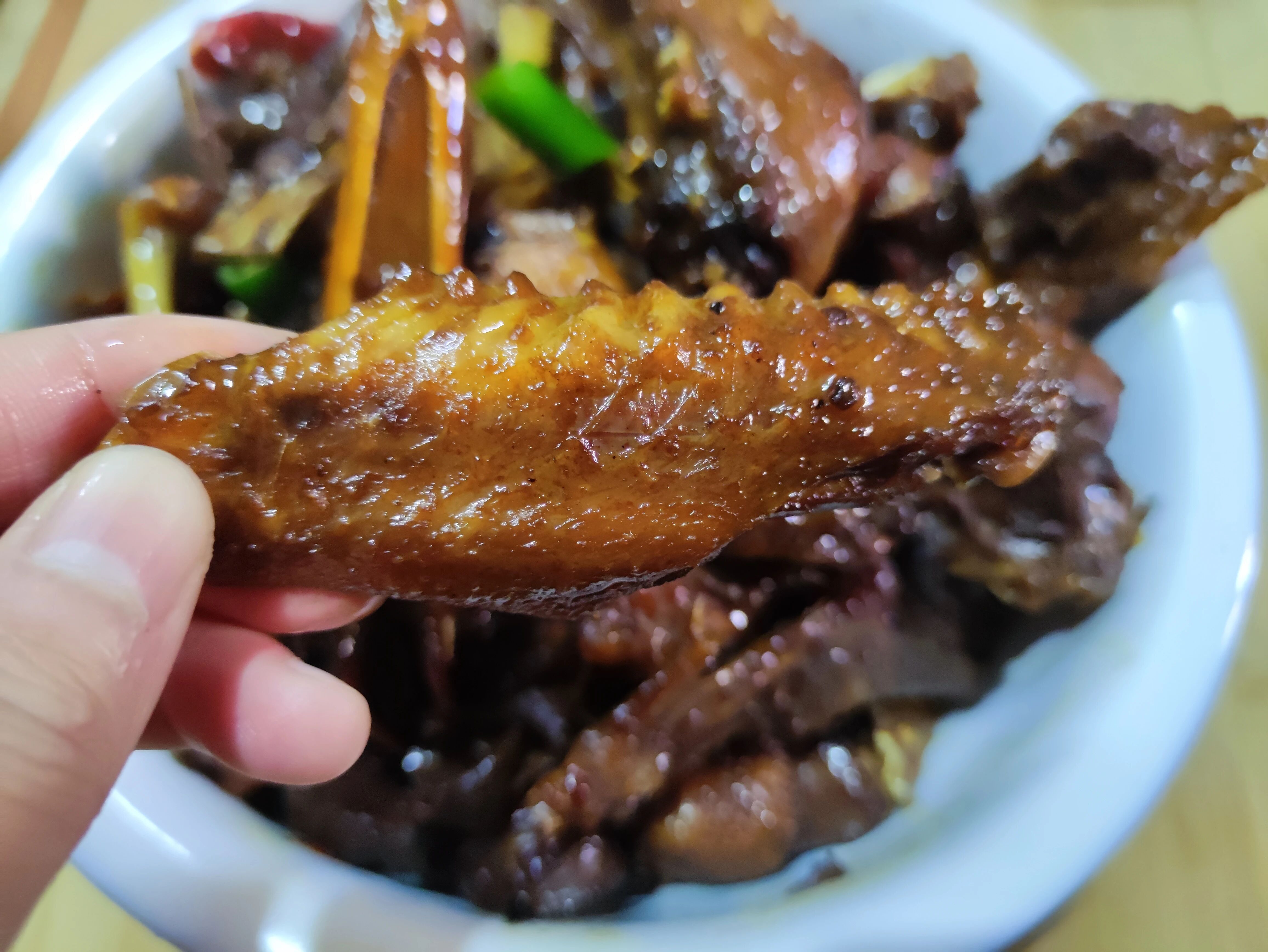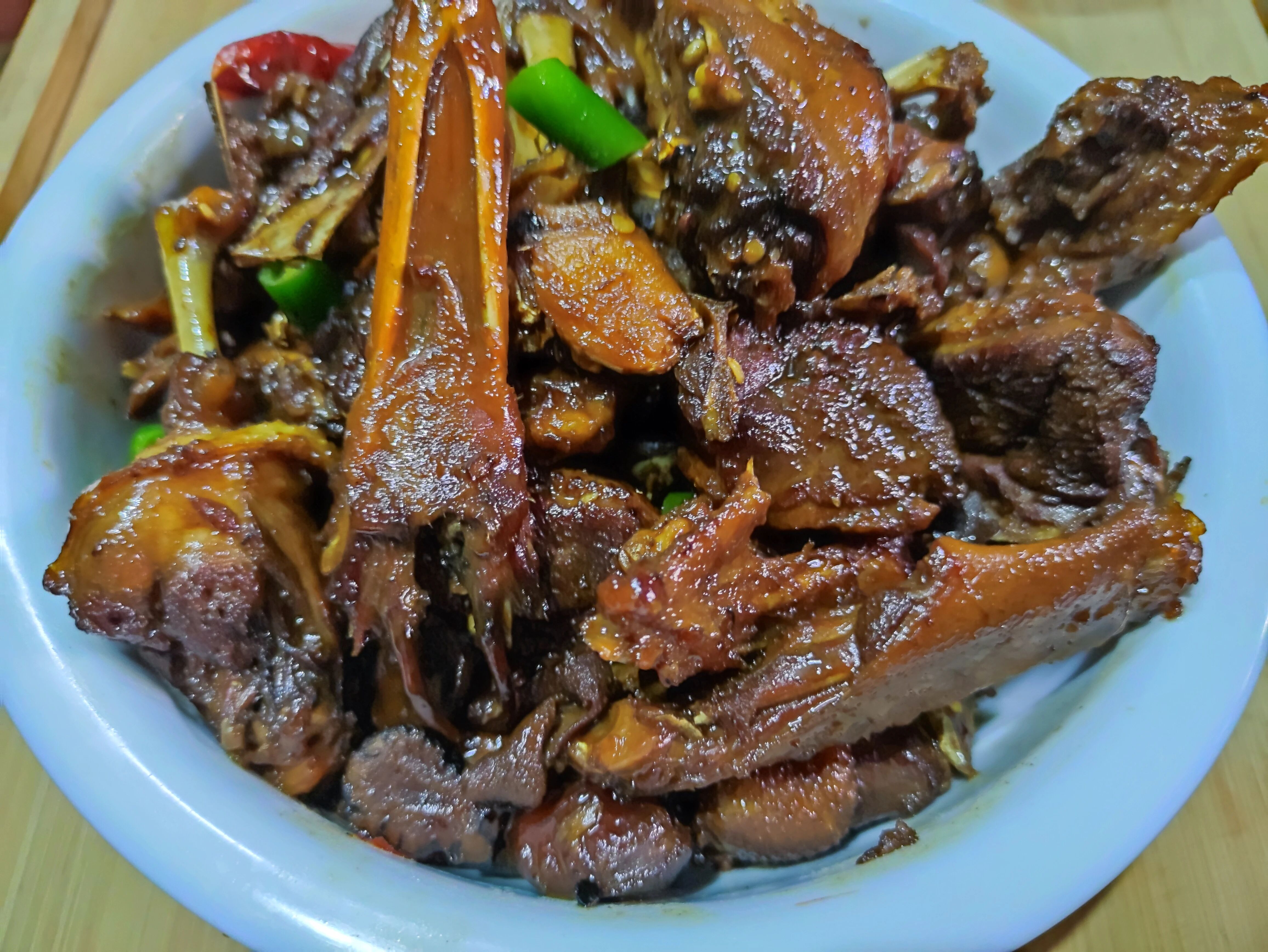 11.收汁完成后,倒入切好的青红辣椒进行调味增色。因为加了白糖,有糖浆,所以收汁后锅底都会变成这样焦焦的,不过味道是特香,比外面卖的卤鸭肉还好吃。