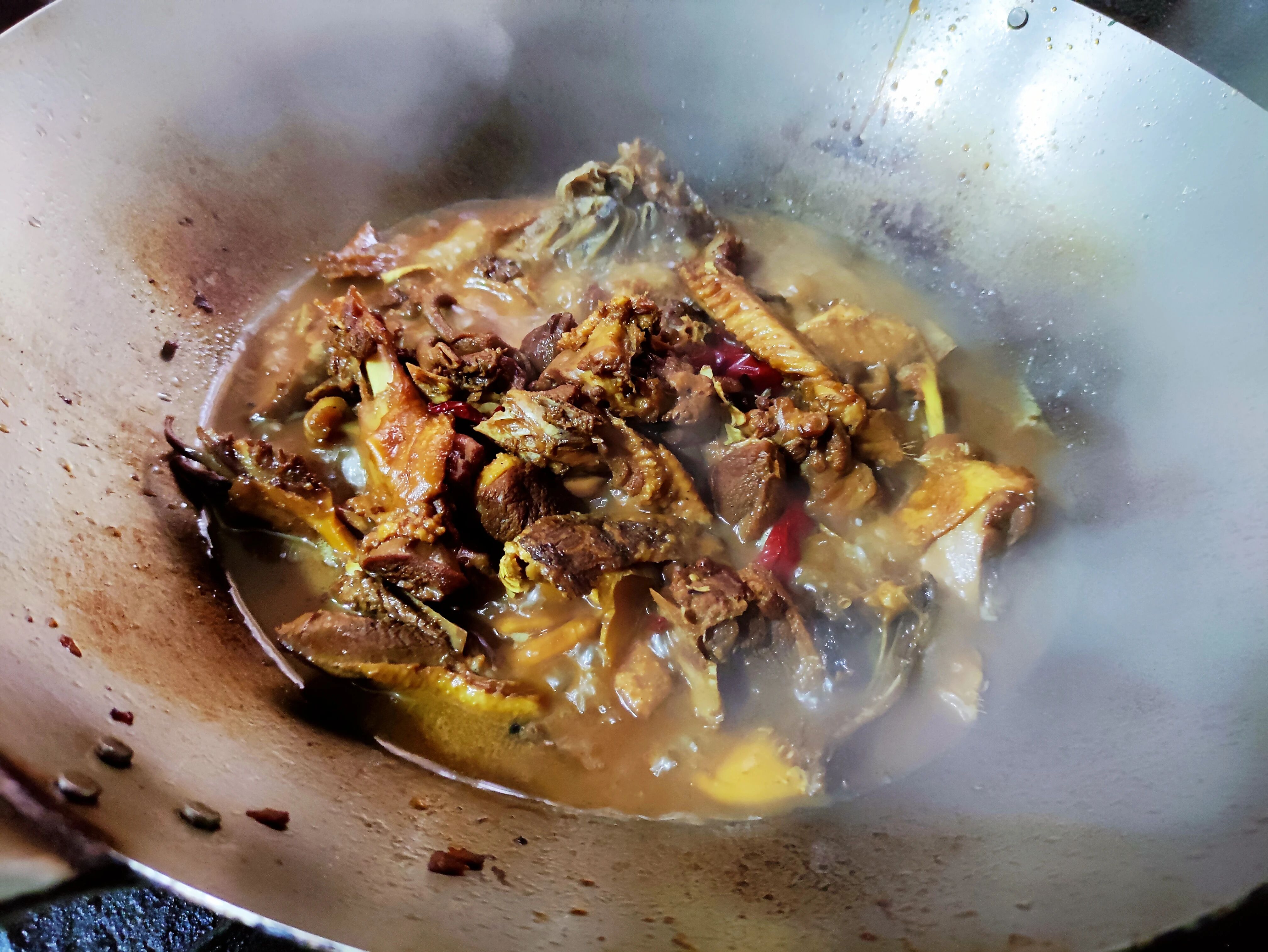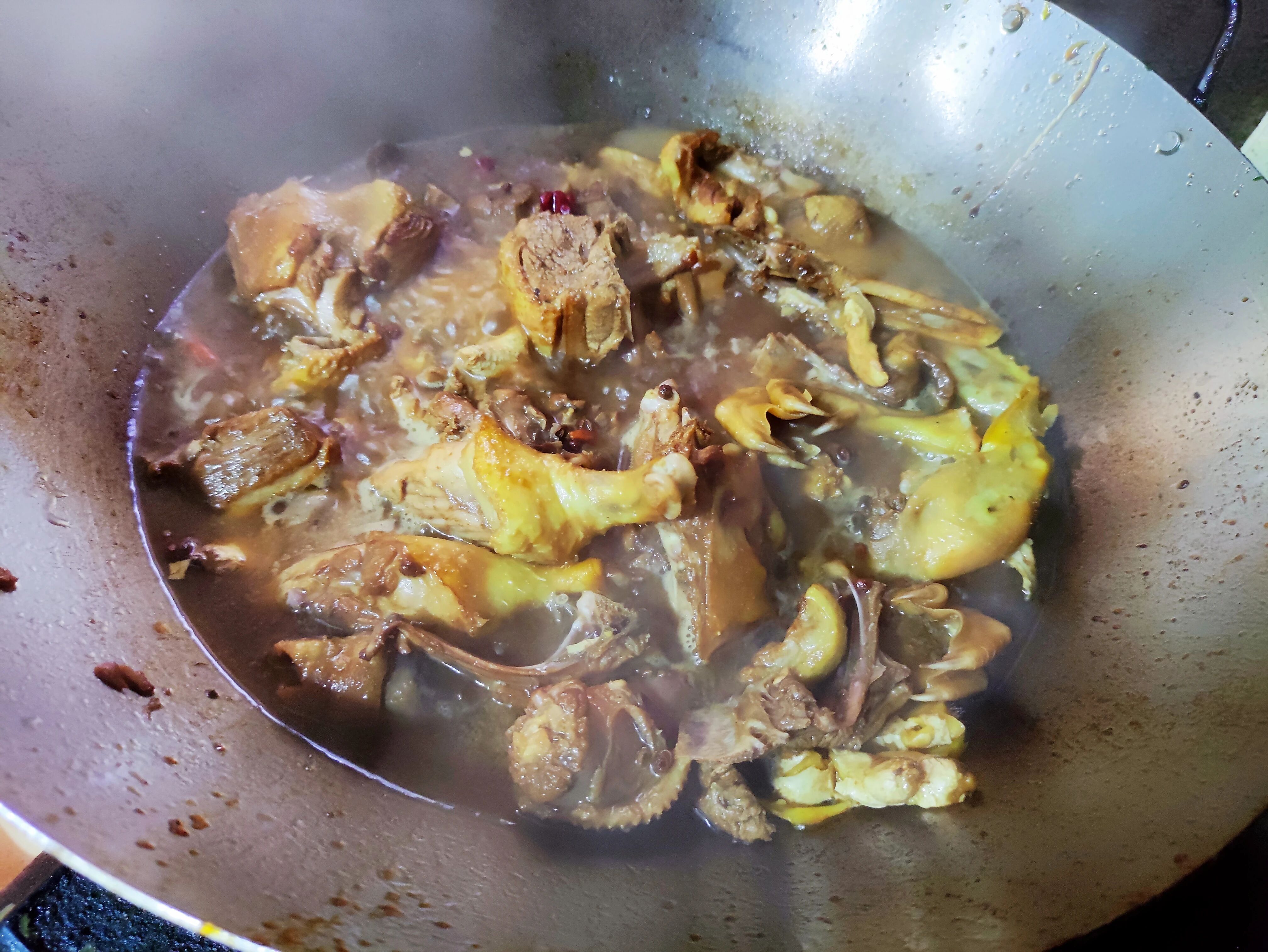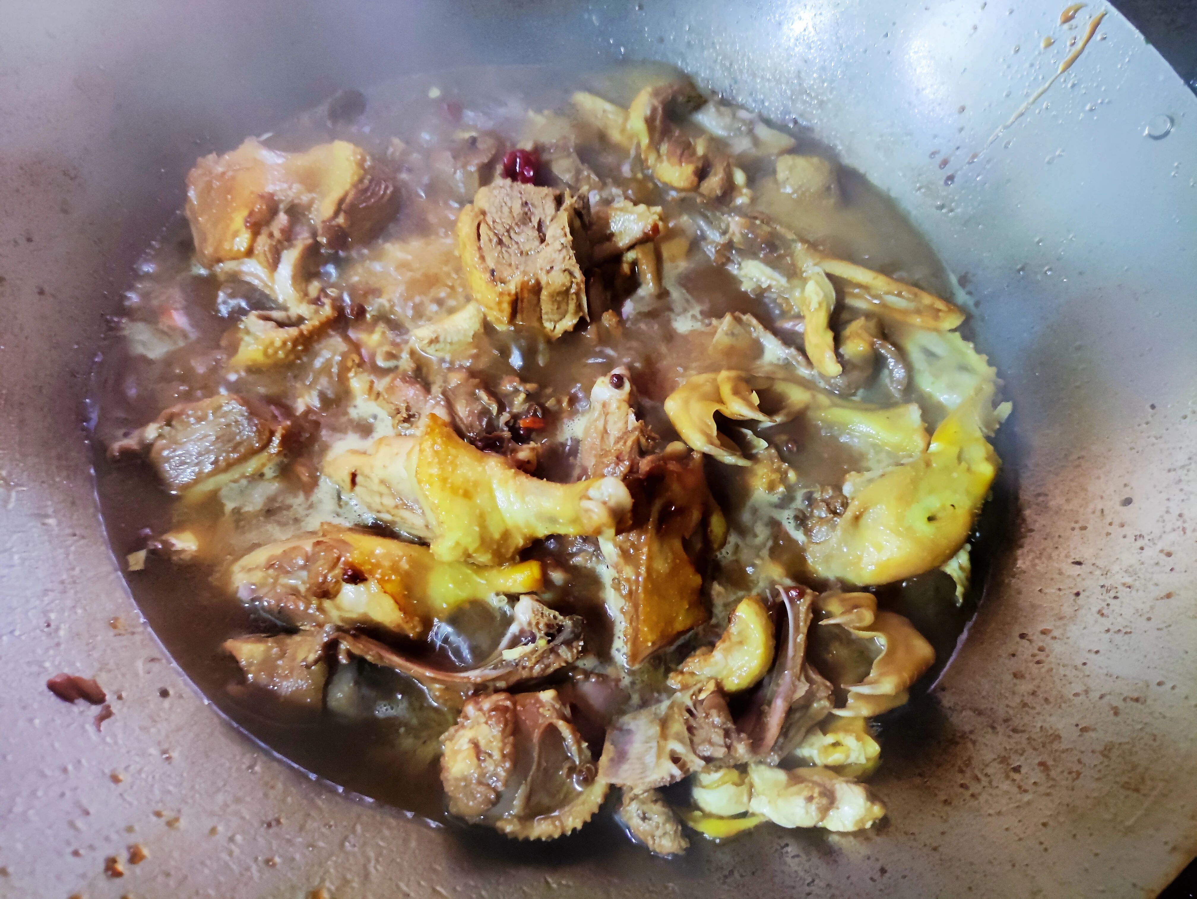 9.高压锅煮肉很快就可以煮烂,不过水分不易流失,所以高压锅煮好后,我又将它们放入锅中,进行收汁。