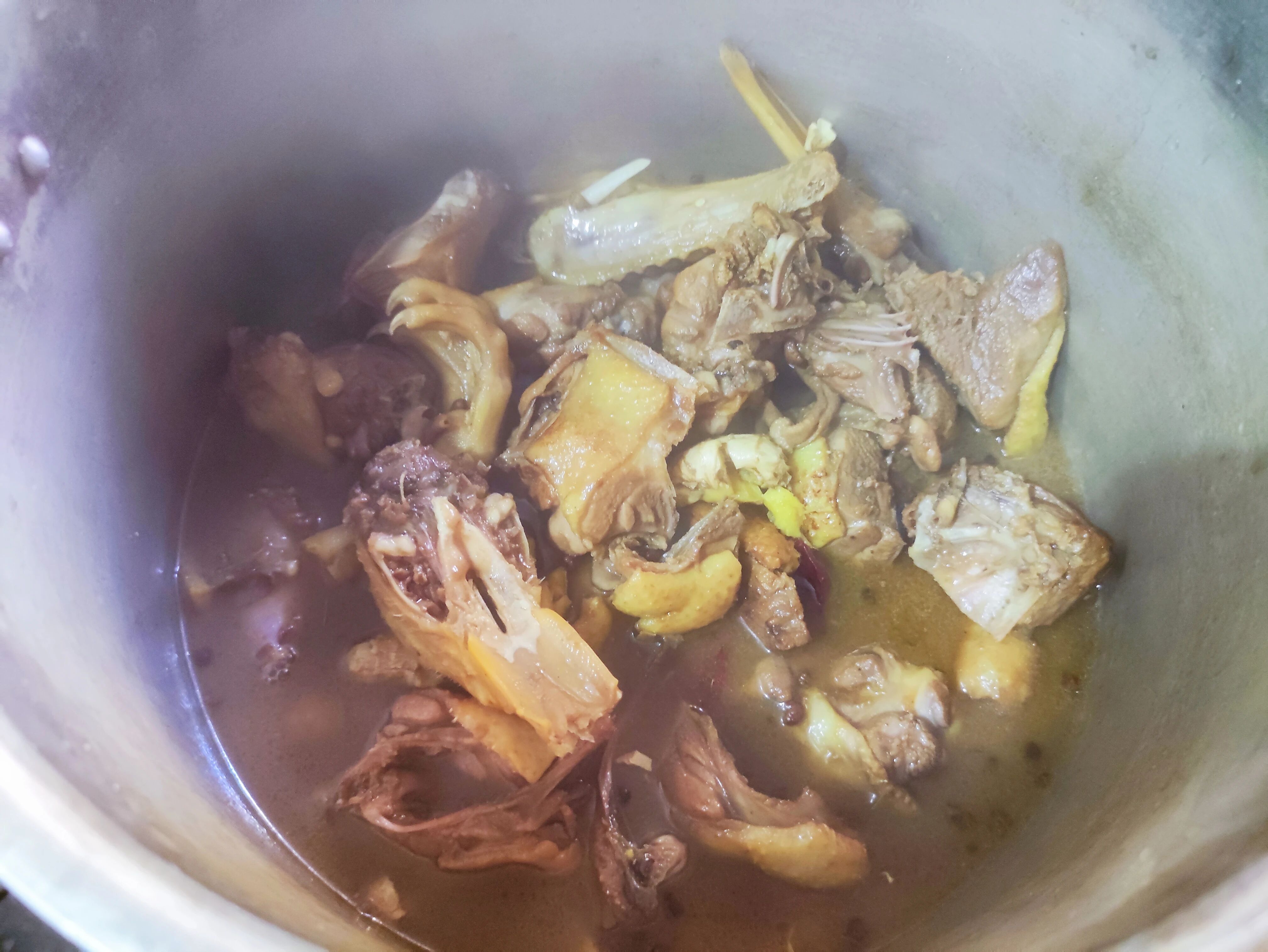 8.焖好后的肉开锅,倒入一个干净的高压锅。鸭肉炒了之后放在高压锅中焖煮,更容易熟,而且入味。这个鸭肉我放高压锅中煮了30分钟。
