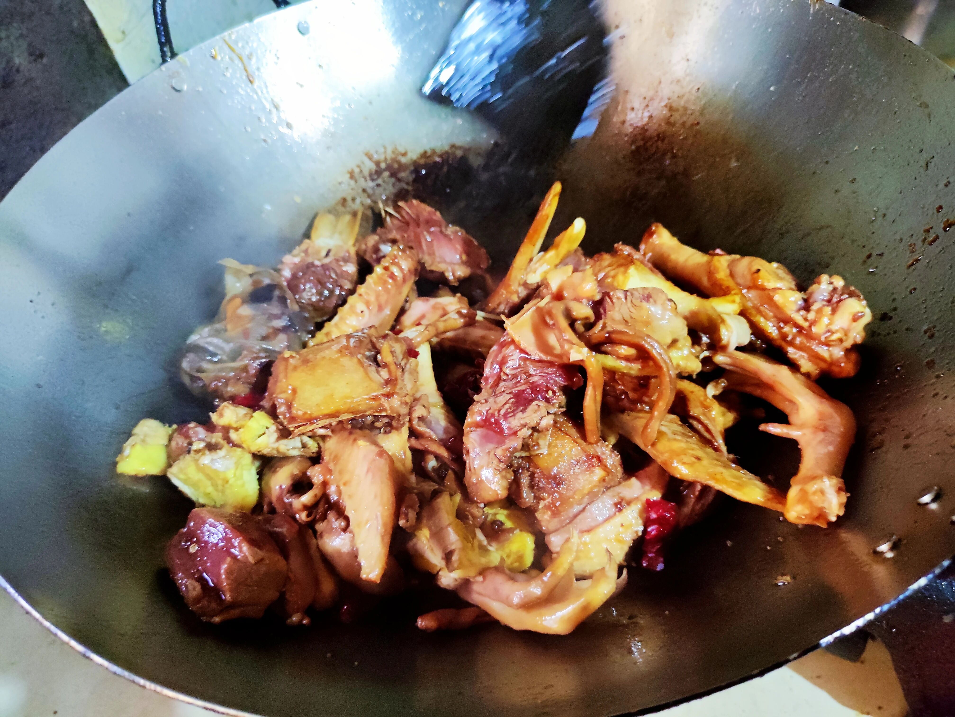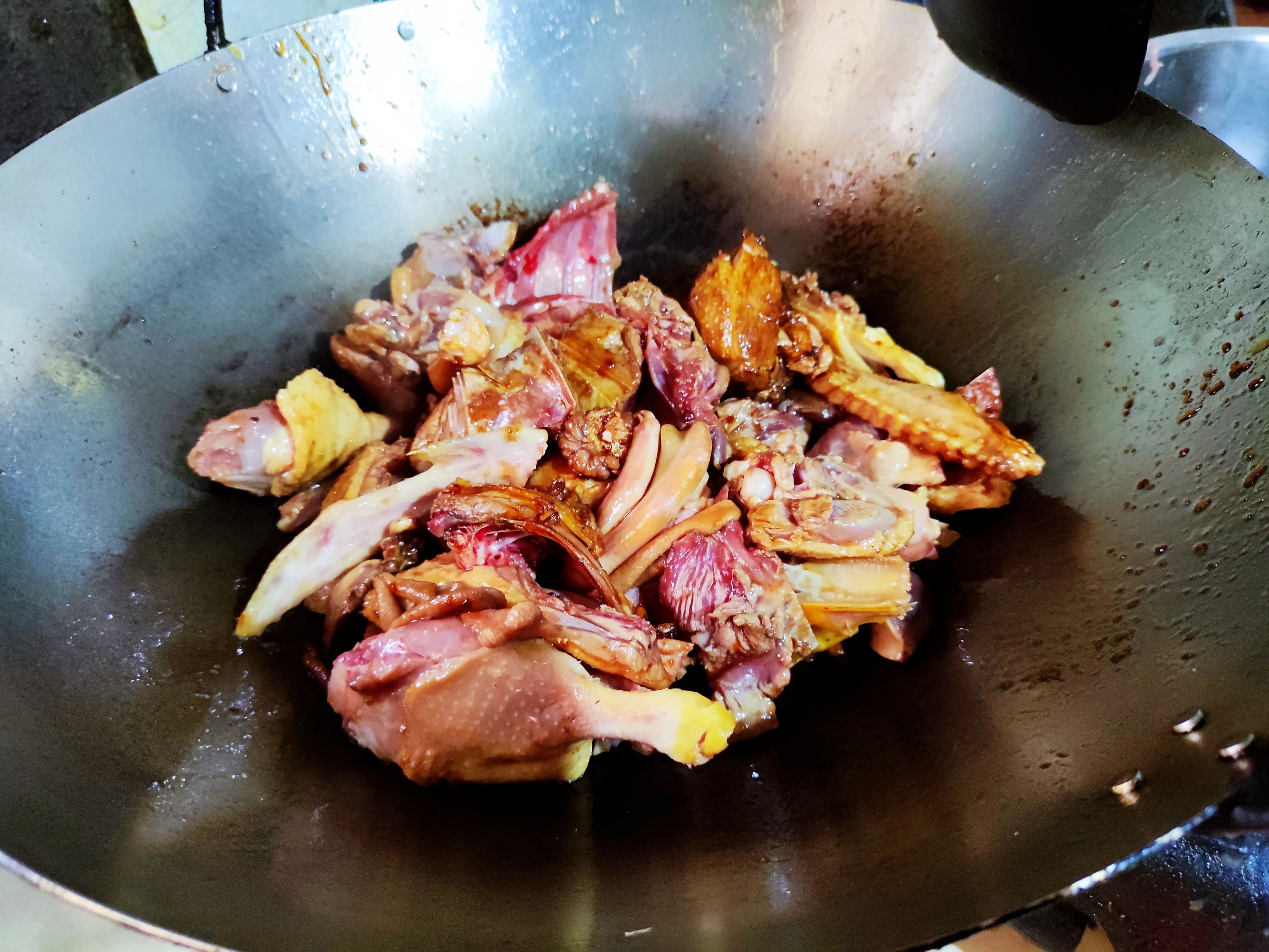 5.倒入切好的鸭肉块,铲子将食材翻炒均匀,使鸭肉都能裹上一层糖浆。