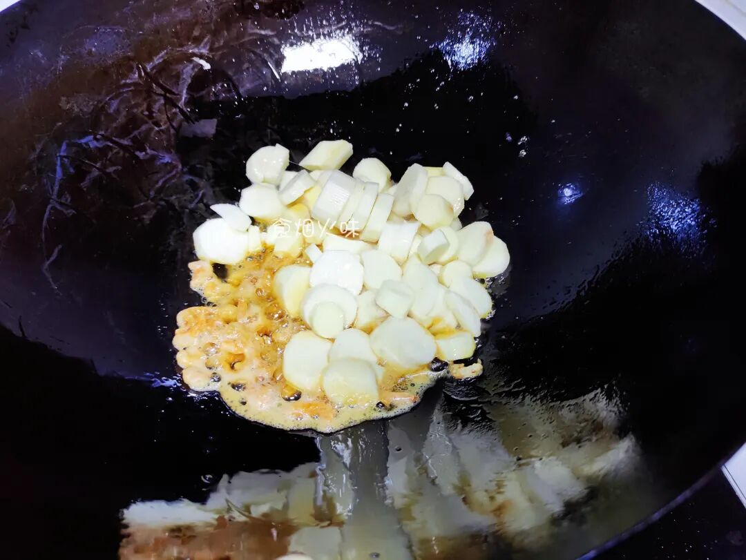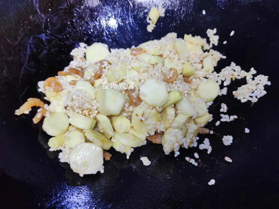 2.准备一个干净的锅,锅中的水干后,倒入适量的油锅,锅中的油热后,将洗净后的虾米倒入锅内用小火煸炒一下,切好后的山药块也倒入锅内,稍微炒翻炒一下,大概炒个20来秒钟;