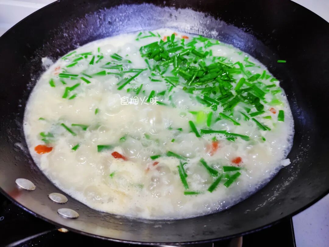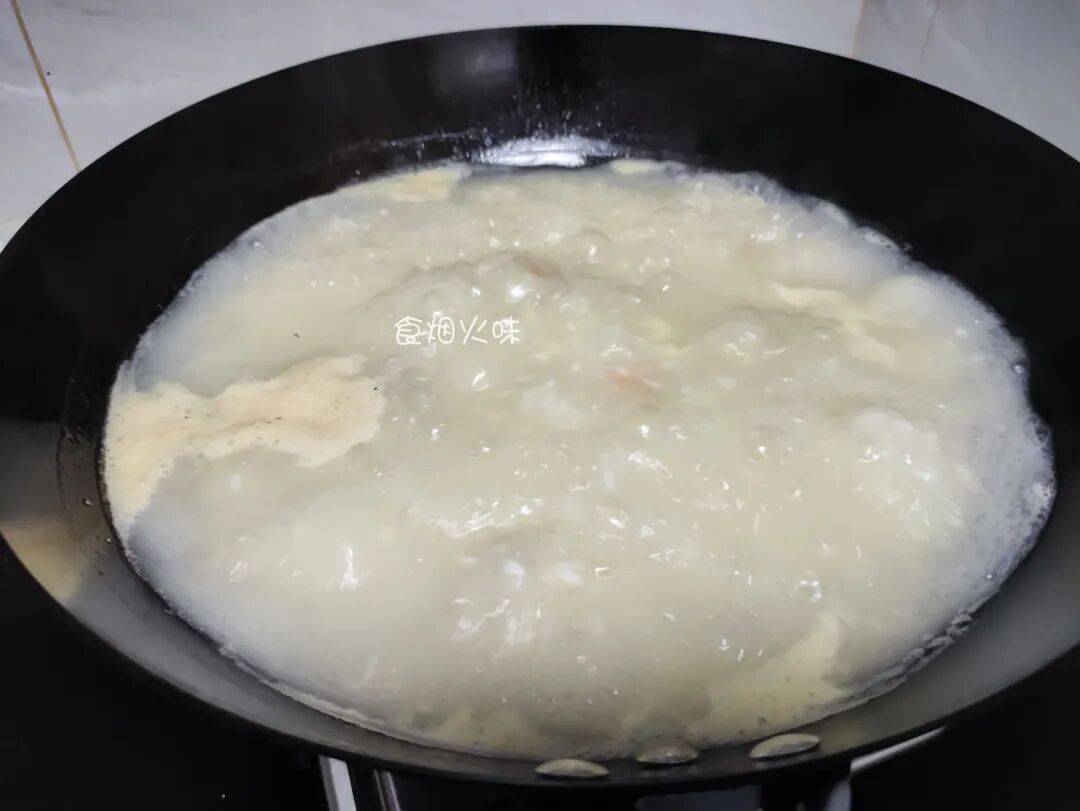 食材炒好后,往锅内加入适量的凉水,然后盖上盖子,锅中开大火。用大火将锅内的水煮开,然后就可以转为小火。锅中的水开后转为小火,再熬煮20来分钟,直到锅中的汤汁浓白,大米开花的状态就差不多了;